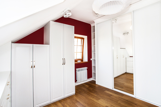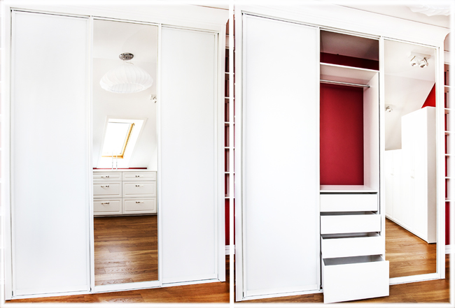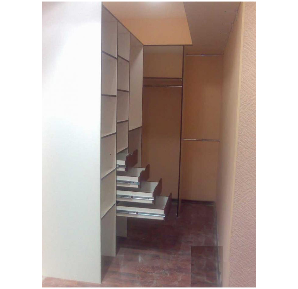 Оснащается штангами для одежды, полками и выдвижными ящиками.