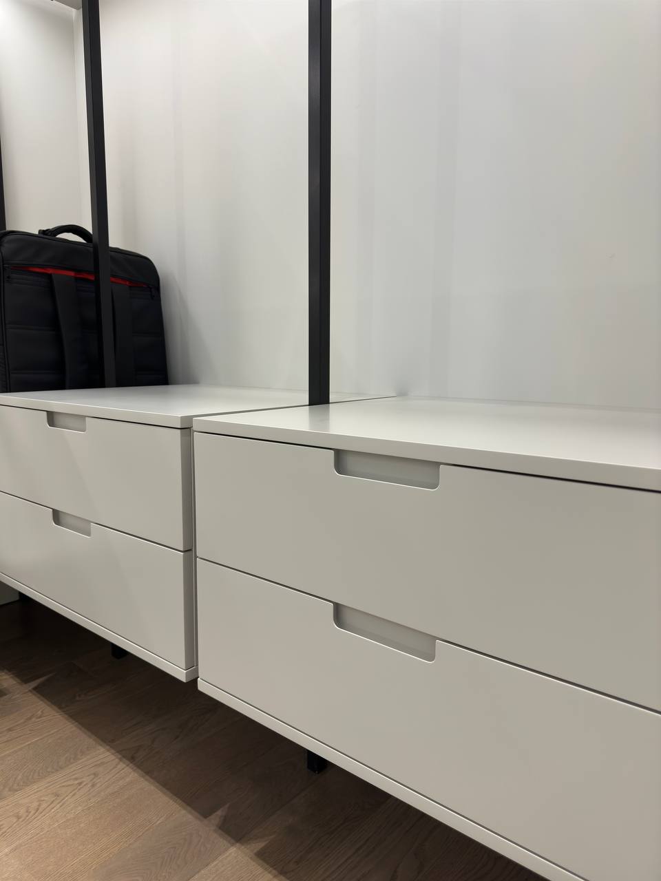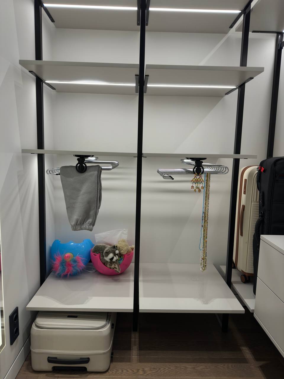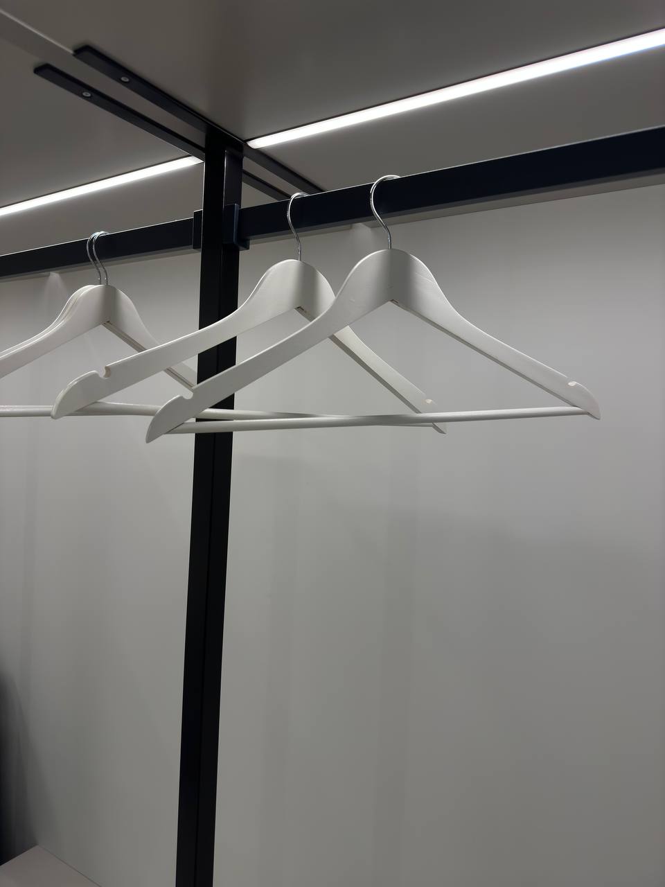 Эта гардеробная система — воплощение стиля и продуманности. Лёгкая конструкция на чёрном металлокаркасе и открытые полки создают ощущение простора даже в небольшом помещении. Идеально подойдёт для современных интерьеров в стиле минимализм, хай-тек и сканди.