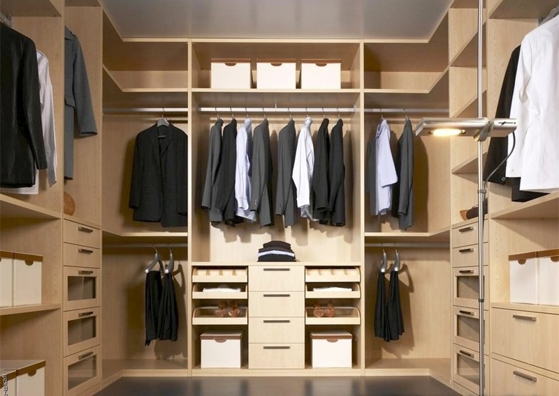 Штанги для одежды, выдвижные ящики открытые полки.