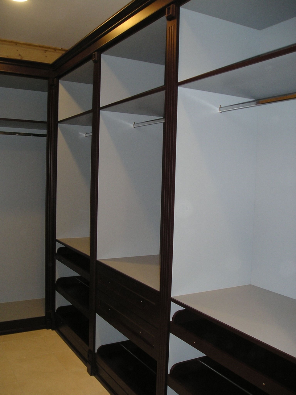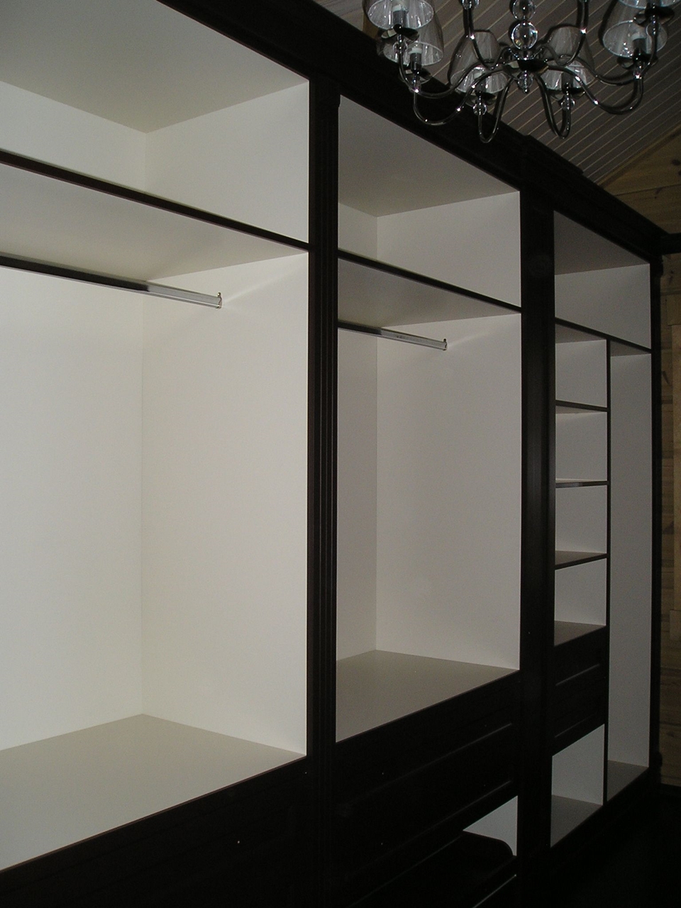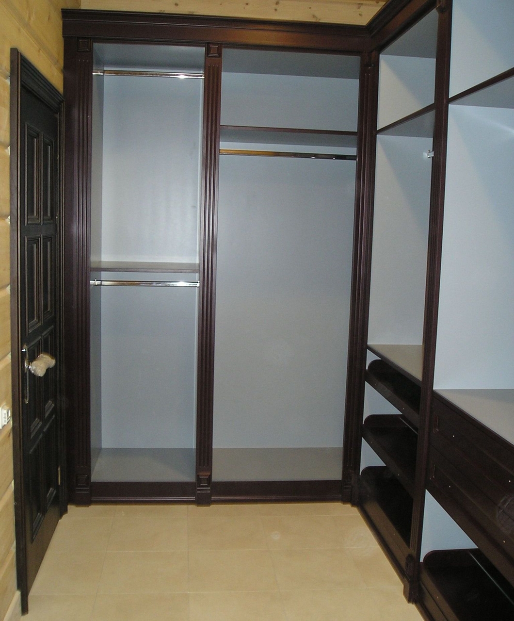 Оснащается штангами для одежды, полками и выдвижными ящиками.