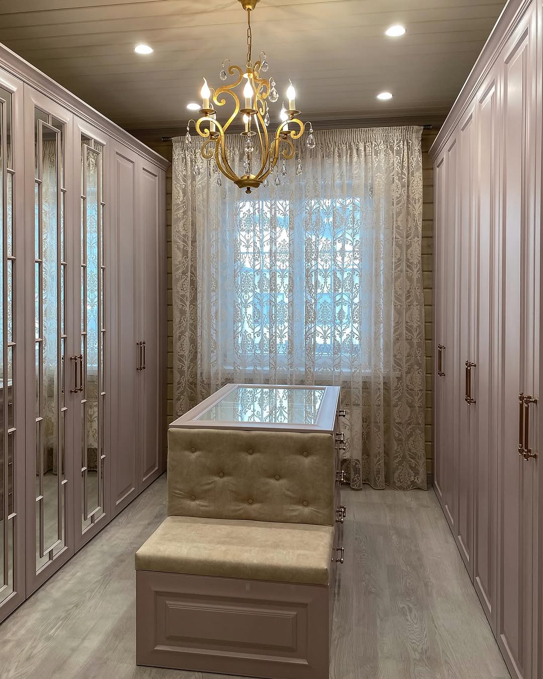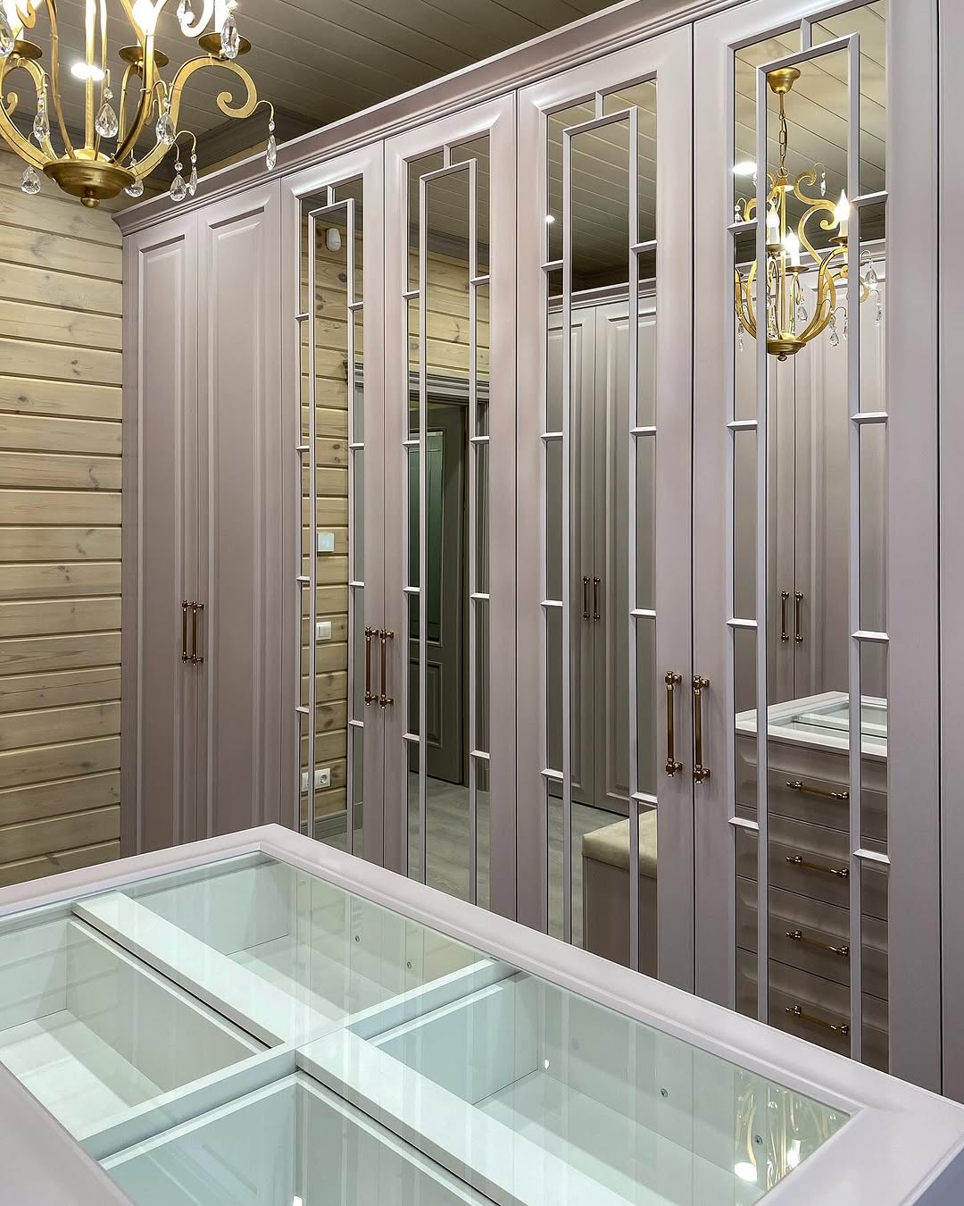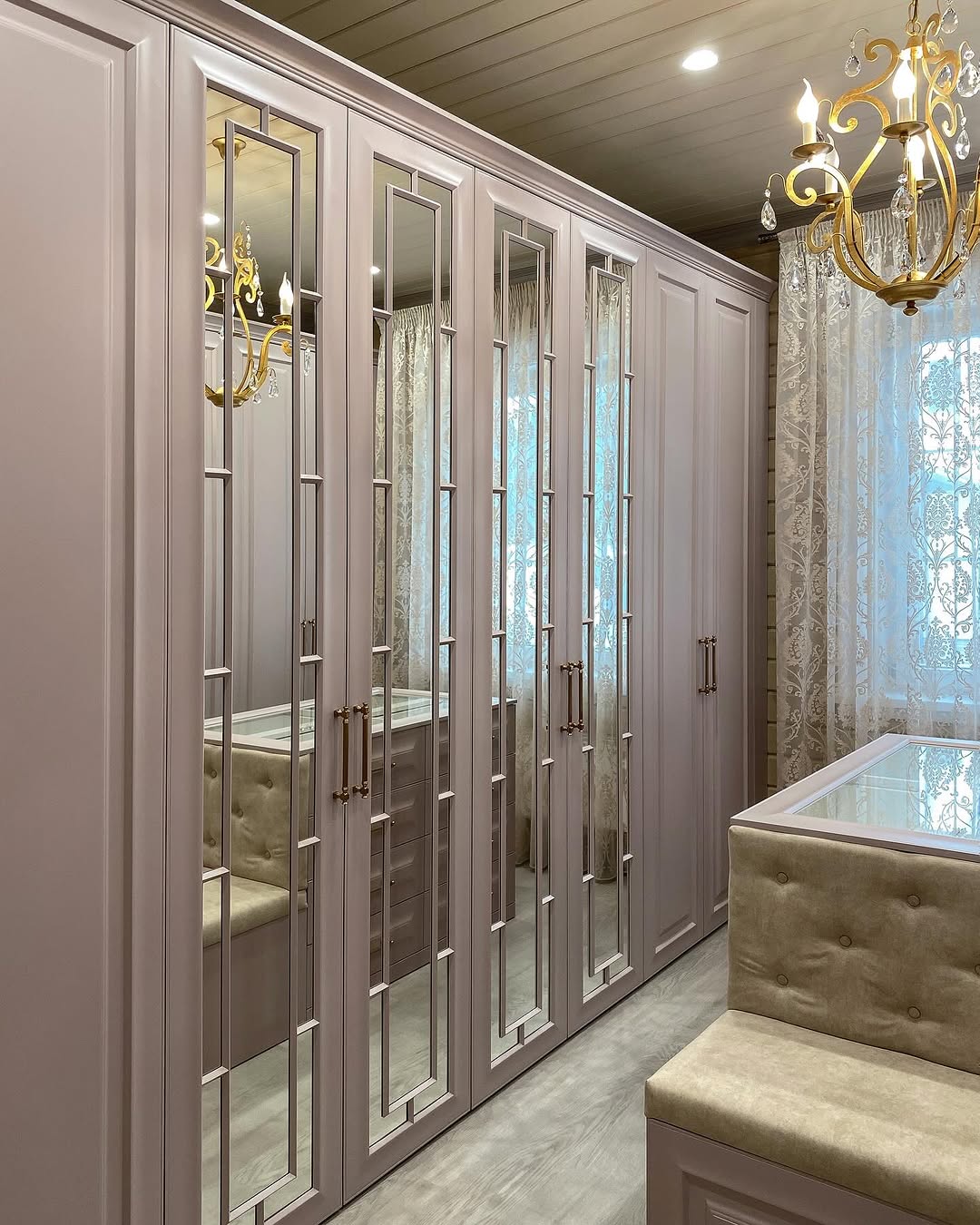 Элегантная гардеробная в классическом стиле с витражными зеркальными фасадами — роскошь, которая говорит сама за себя. Центральный остров с прозрачными витринами придаёт интерьеру статус, а продуманное наполнение делает её максимально функциональной.