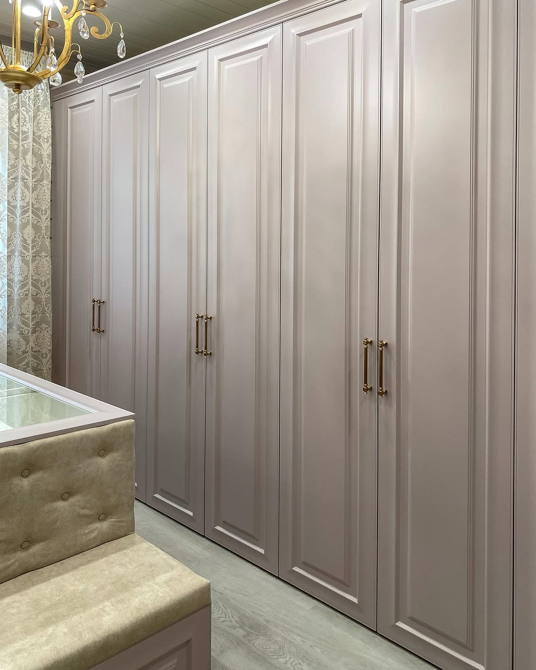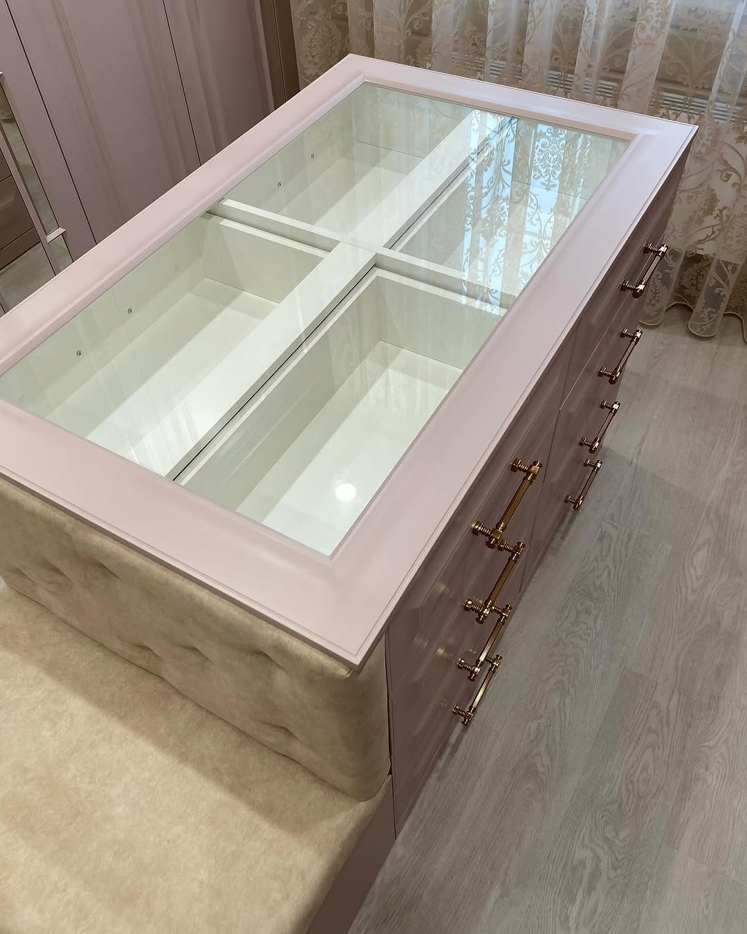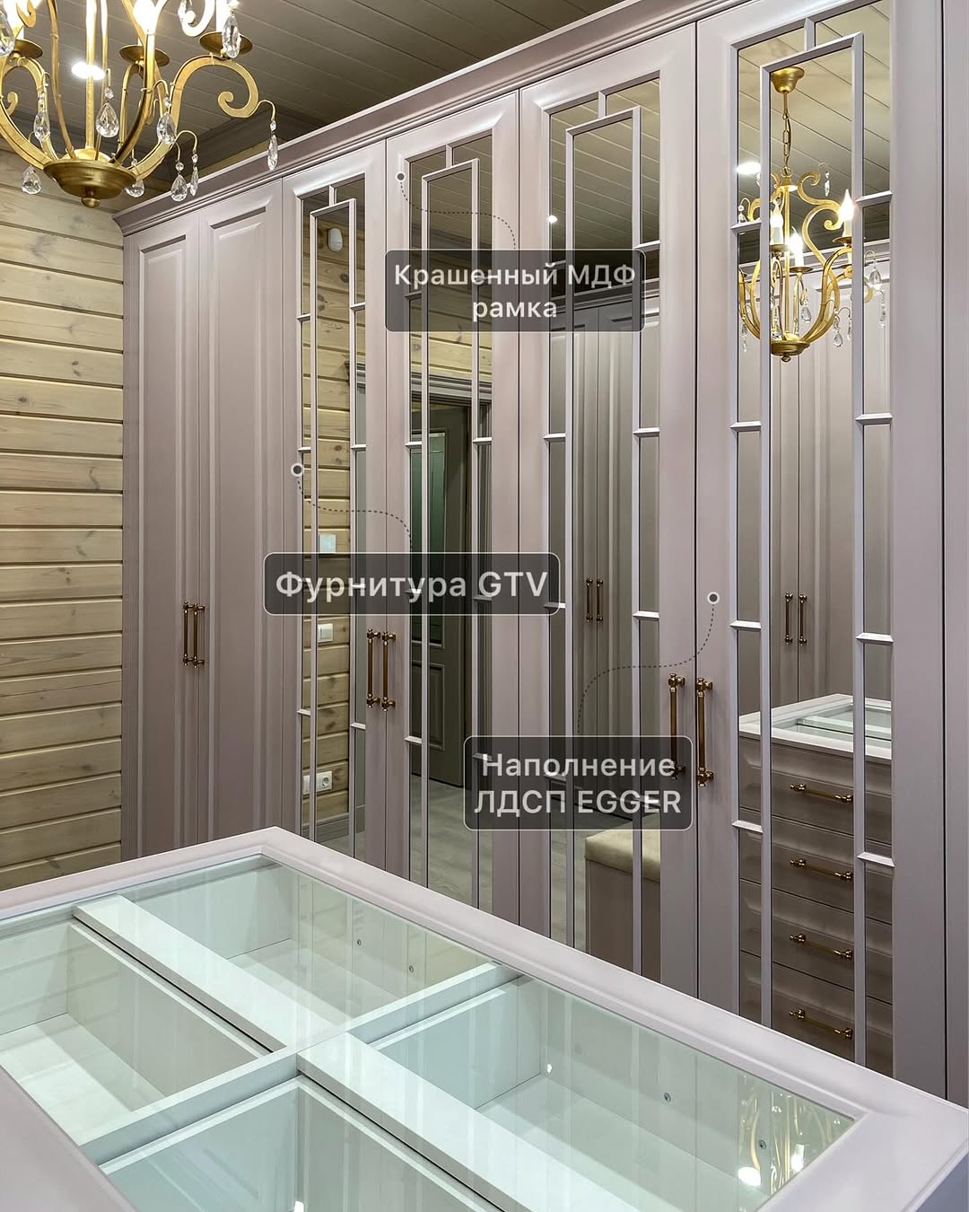 Элегантная гардеробная в классическом стиле с витражными зеркальными фасадами — роскошь, которая говорит сама за себя. Центральный остров с прозрачными витринами придаёт интерьеру статус, а продуманное наполнение делает её максимально функциональной.