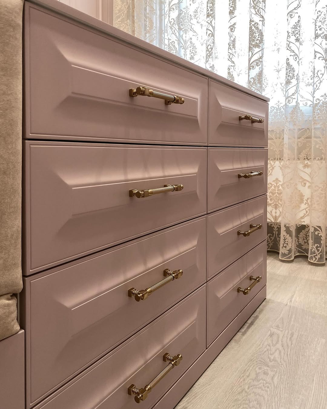 – Фасады: МДФ с матовой покраской и декоративными зеркальными вставками в раскладке
