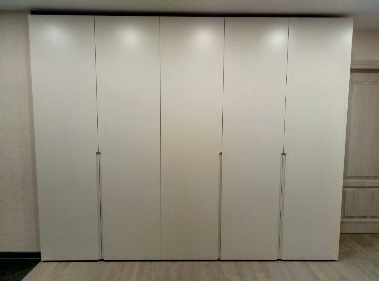 Широкий пяти-дверный шкаф изготовлен в традициях современного минимализма в перламутровом матовом оттенке фасадов. Особая изюминка стиля заключается ни столько в лаконичном исполнении, сколько в аккуратных резных ручках, которые не загромождают интерьер мелкими выступающими деталями.