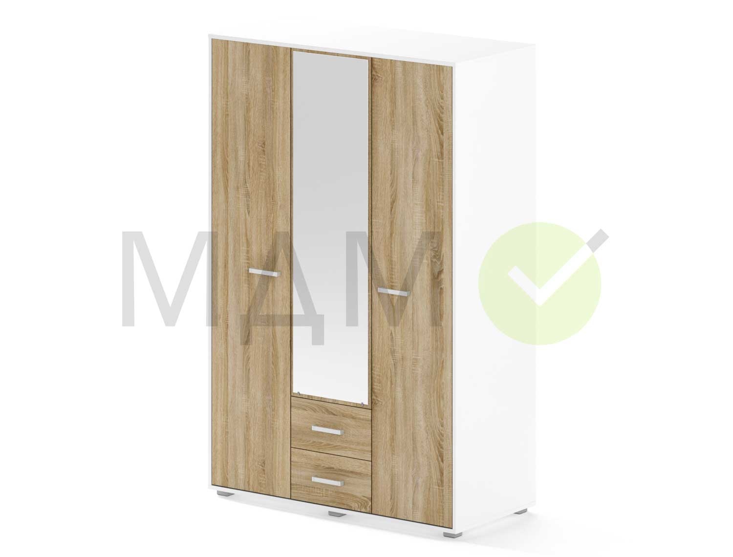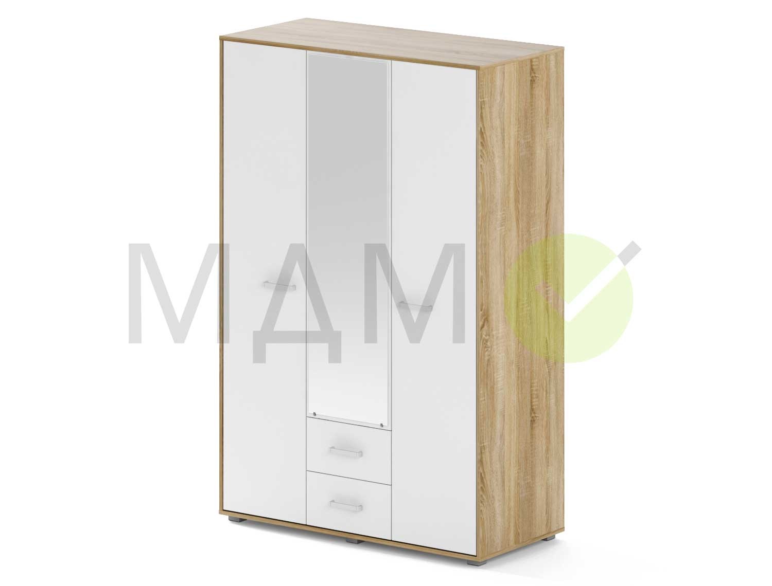 Трехстворчатый гардеробный шкаф изготовлен из качественного ламинированного ДСП. Шкаф имеет отделение под головные уборы, хромированную штангу для вешалок, два выдвижных ящика и 4 полки с правой стороны. Благодаря высоте шкафа 180 см., шкаф не будет смотреться громоздко даже в небольшой комнате, однако имеет большую вместимость. Зеркало на центральной двери окончательно дополняет внешний вид и выполняет важную роль в жизни любой семьи.