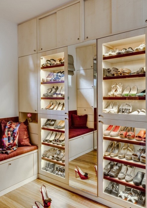 - Полки с подсветкой. Вы сможете легко и быстро найти нужную пару обуви даже в тёмное время суток.