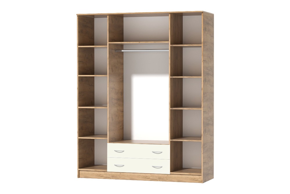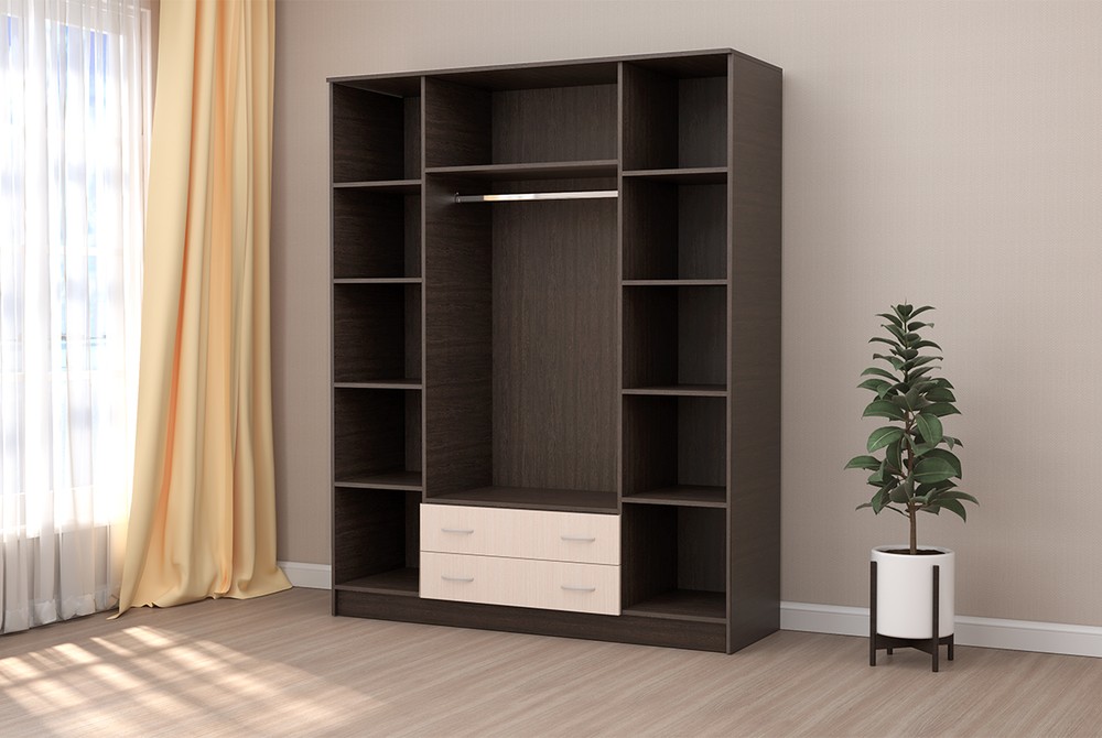 Оснащается штангами для одежды, полками и выдвижными ящиками.