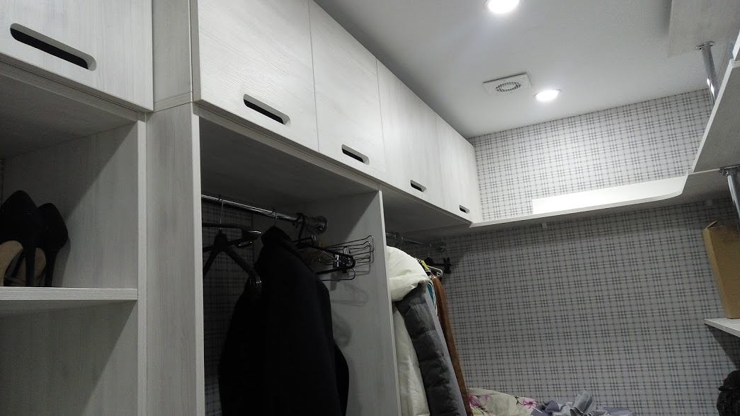 Большой гардеробный шкаф сделан в просторном проеме комнаты. Шкаф состоит из множества полезных элементов: полки, штанги для верхней одежды, выдвижные ящики, встроенная гладильная доска, спец.отделение для пылесоса и бытовой утвари. Гардеробныя выполнена из ЛДСП и по желанию может комплектоваться различными аксессуарами (брючницы, корзины, лифты, выдвижные ящики, и т.д.).