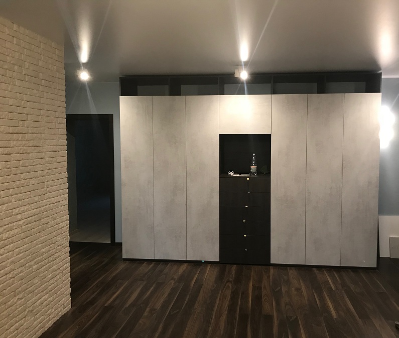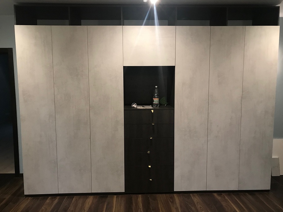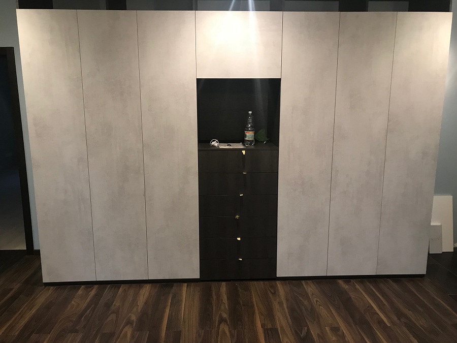 Шкаф встроенный из материала ДСП итальянского производства. Большое количество полок и выдвижных ящиков. Металлическая труба для вешалок. Гардеробный шкаф отличается своей практичностью и функциональностью, а также интересной конструкцией дверей.