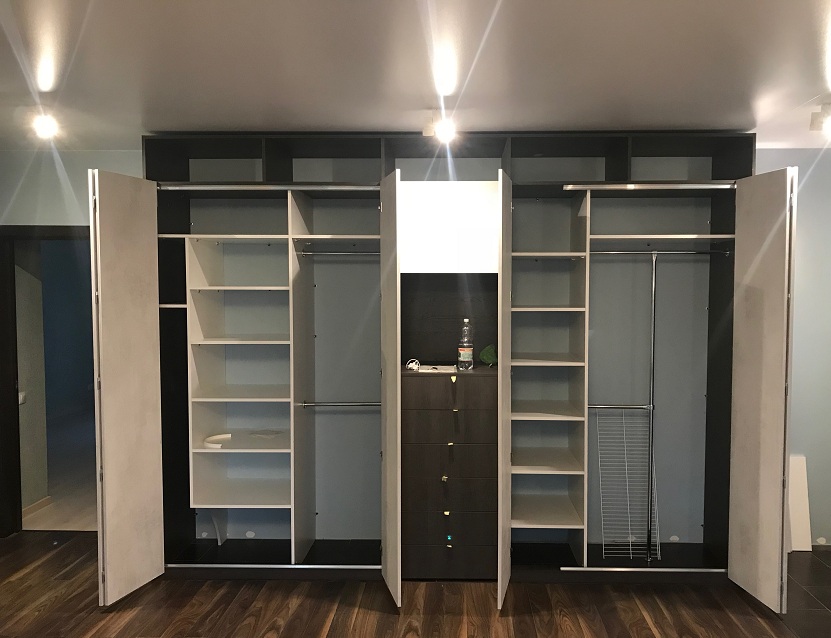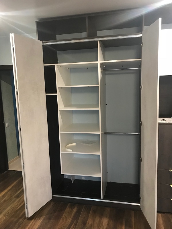 Изготавливается из ЛДСП. Штанги для одежды, выдвижные ящики, открытые ниши.
