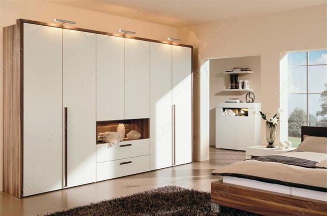 Оснащается шкафом, открытыми нишами, штангами для одежды, ящиками, подсветкой.