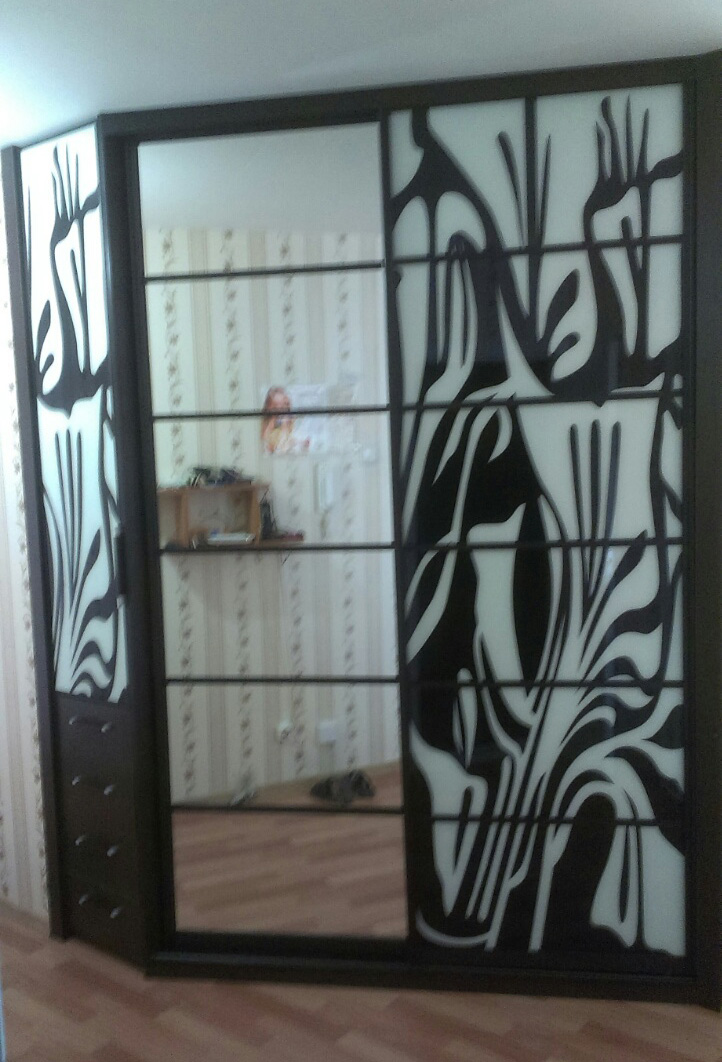 Очень яркая и необычная модель линейного шкафа-купе оборудована не только раздвижными створками, но и совмещенным шкафом с выдвижными полками и распашной дверцей. Раздвижные створки выполнены в черно-белом цвете и образую очень контрастный абстрактный рисунок. Вторая часть створки декорирована зеркальным полотном с темными рейками.