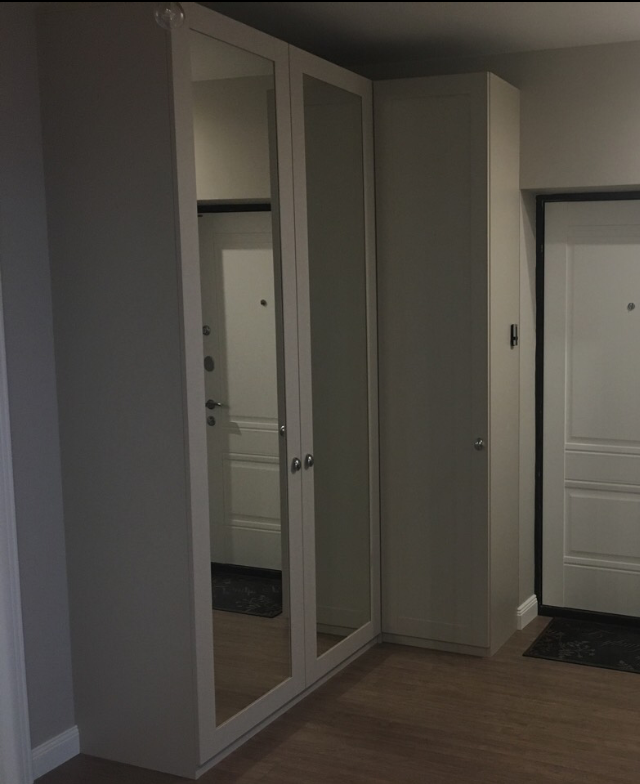 Высокое зеркало. Стильный и компактный 3х-створчатый шкаф. Посередине отдел с полками, по бокам - со штангой.