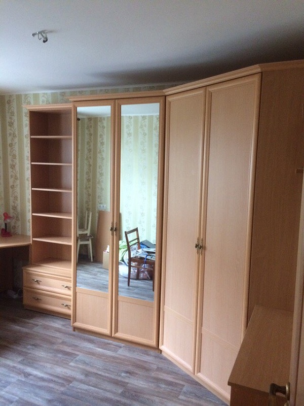 Угловой шкаф обладает вместительным объемом для хранения одежды. Одна из секций зеркальна и открывается распашным способом. Широкие полки можно использовать для размещения предметов декора.