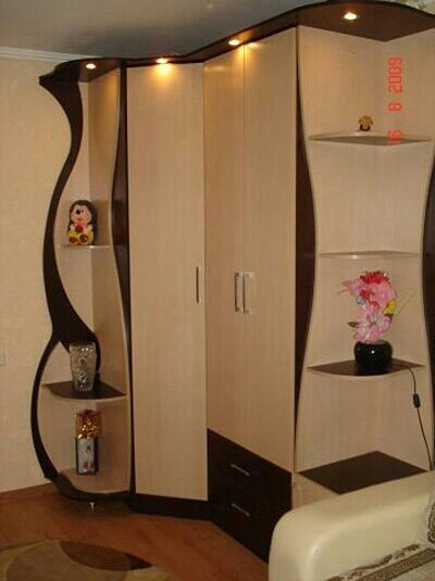 Оснащается штангами для одежды, полками и выдвижными ящиками.