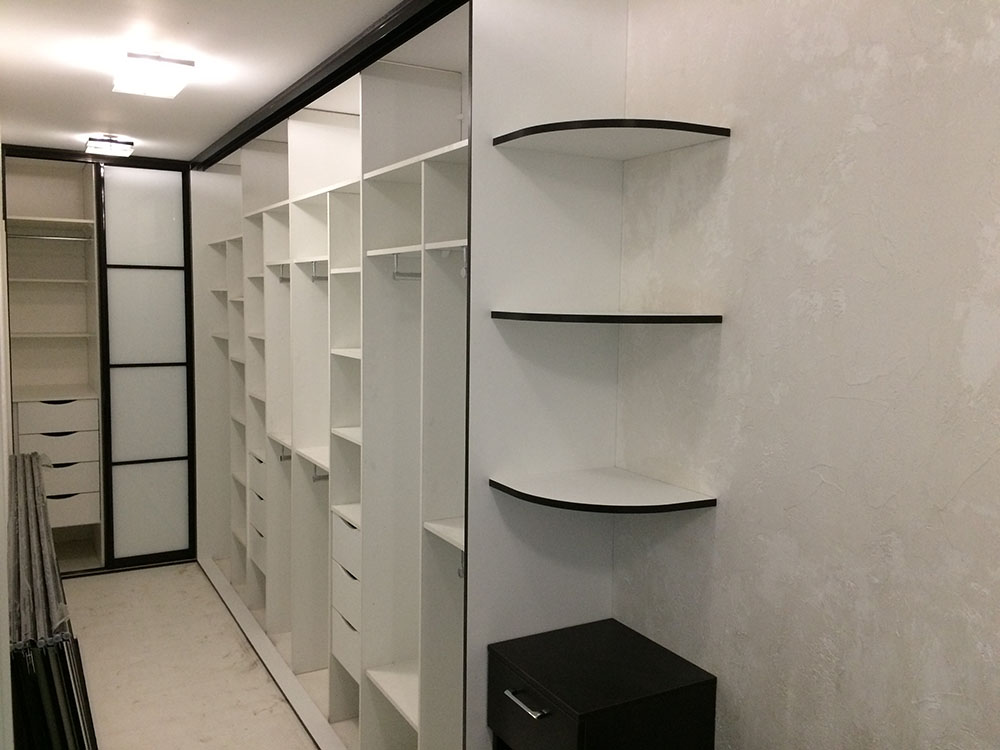 Белый угловой шкаф купе оснащен многочисленными вместительными полками для вещей, выдвижными ящиками без ручек и хромированными рейками для вешалок. Раздвижные створки выполнены из белого матового стекла с черным профилем.