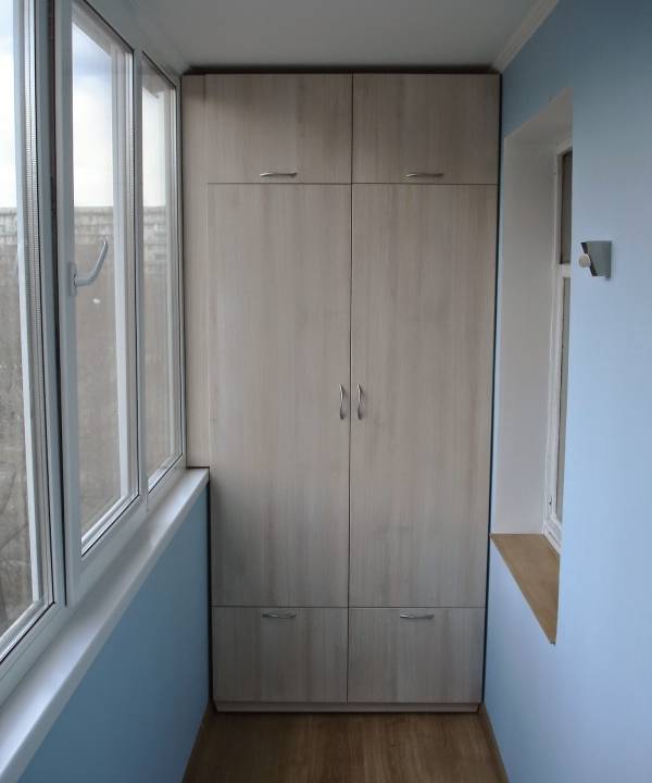 Модель изготовлена из ламинированного ДСП. Внутри предусмотрено большое количество полок. Шкаф на балкон состоит из нескольких отделений. Вместительное нижнее оснащено распашными дверями, а верхнее – раздвижными.
