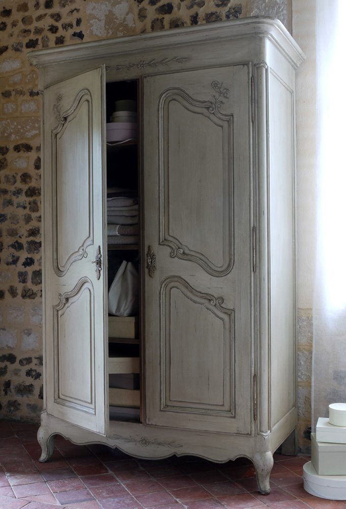 Корпус и фасады серого цвет. Штанги для одежды, выдвижные ящики, полки.