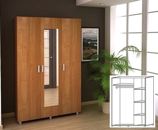 Оснащается штангами для одежды, полками и выдвижными ящиками.