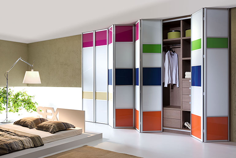 Створки данной модели шкафа-купе имеют складываемую конструкцию. Благодаря ней направляющие дверей делаются уже, чем у раздвижной конструкции. Фасад шкафа украшен вставками цветного лакобеля.