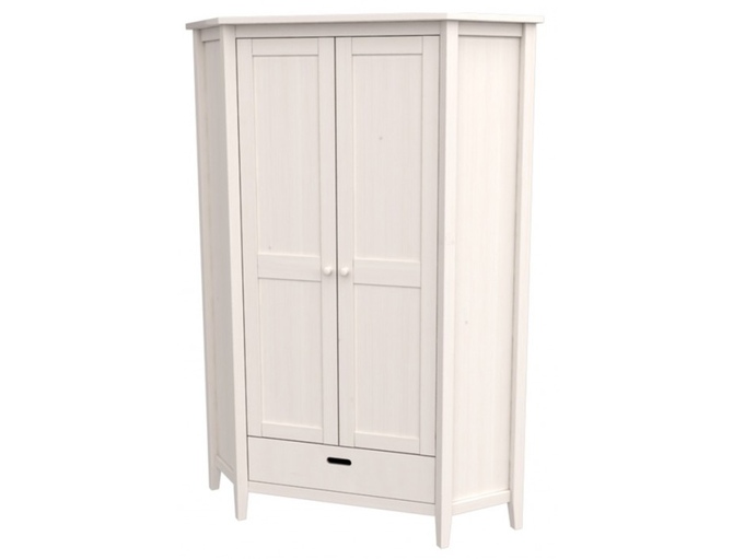 Данная модель шкафа имеет угловую конструкцию, которая позволяет размещать его в небольших помещениях, рационально используя угловое пространство. Конструкция состоит из большой секции, оборудованной двумя распашными створками. В нижней части присутствует выдвижной ящик с оригинальной фурнитурой. Изделие выполнено из массива сосны и отличается высокой прочностью и долговечностью.