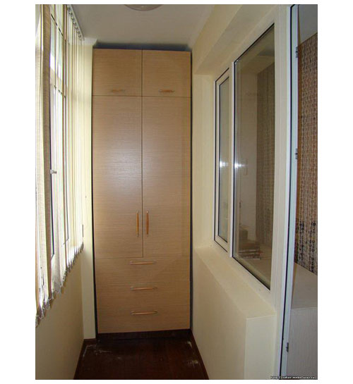 Шкаф для балкона представляет собой функциональную модель. Она оборудована несколькими просторными отделениями, выдвижными ящиками и антресолью. С этой моделью вы сможете содержать и хранить ваши вещи в порядке. При изготовлении использовалось качественное и долговечное ДСП.