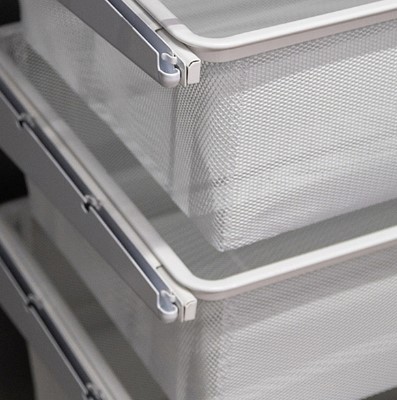 • По желанию клиента одну из секций оборудовали выдвижными сетчатыми корзинами. Они позволяют ставить их плотно друг к другу, экономя пространство.