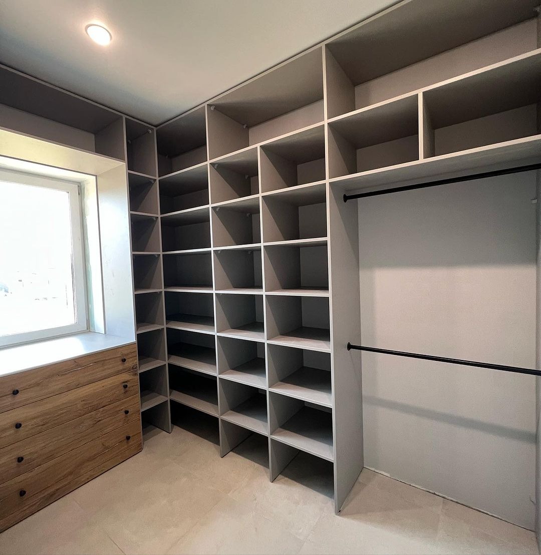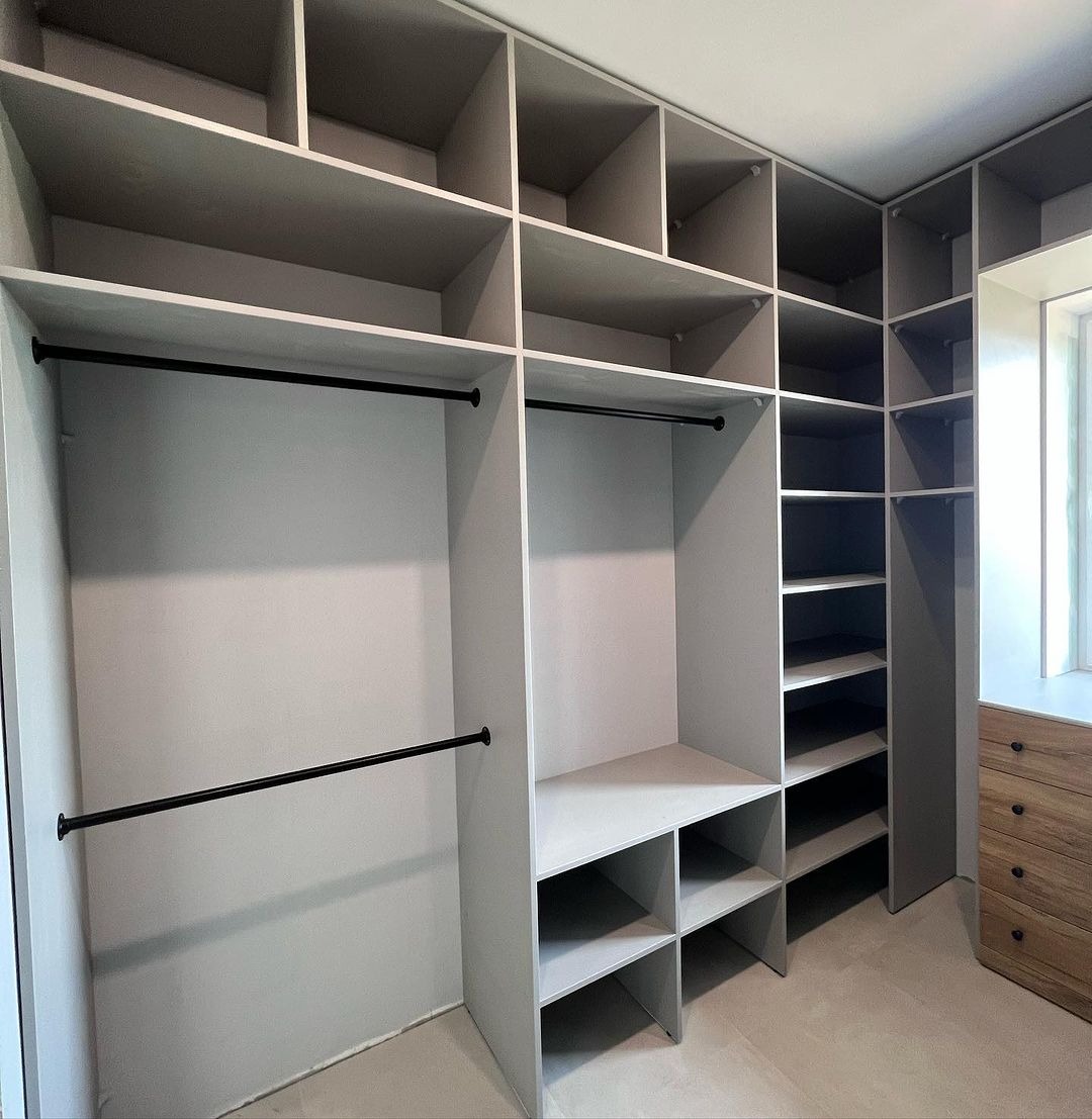 Оснащается шкафом, открытыми нишами, штангами для одежды, ящиками, подсветкой.