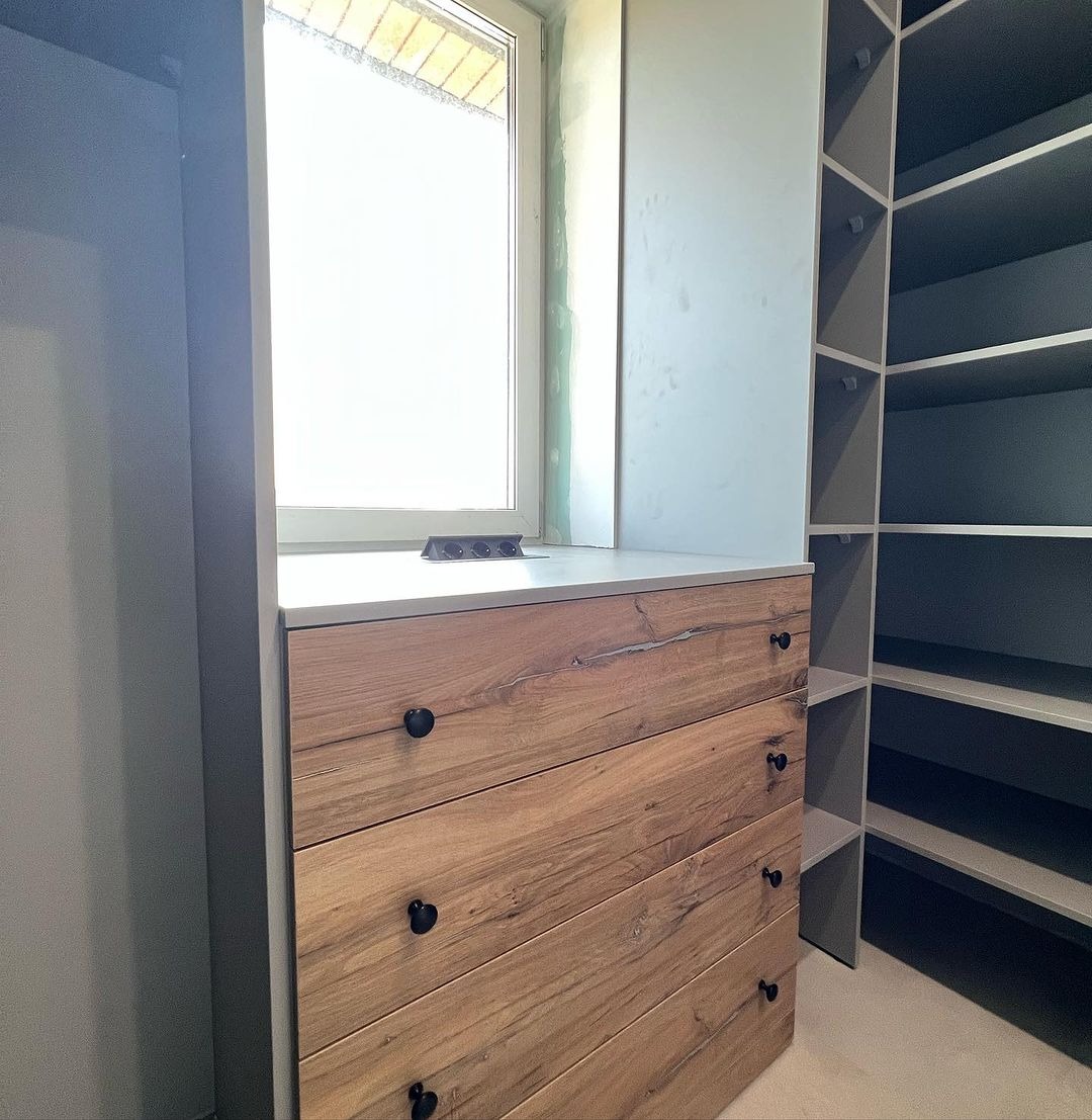 Изготавливается из ЛДСП. Оснащена ящиками, штангами и полками.