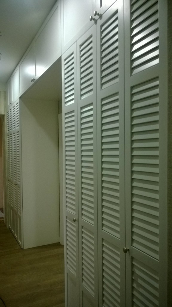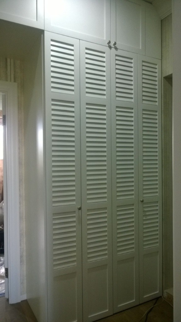 Два широких гардеробных шкафа во всю стену и антресоли образуют арку над дверным проемом. Дверцы шкаф узкие, с жалюзийным фасадом и маленькими круглыми ручками-кнопками. Фасад из натурального массива окрашен в белый цвет.