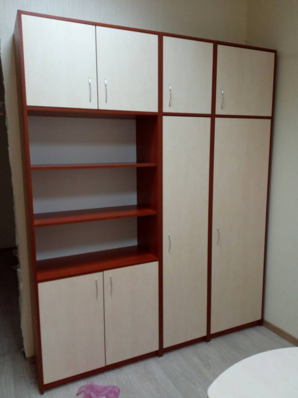 Оснащается стеллажами, штангами, полками для хранения, тумба с выдвижными ящиками.