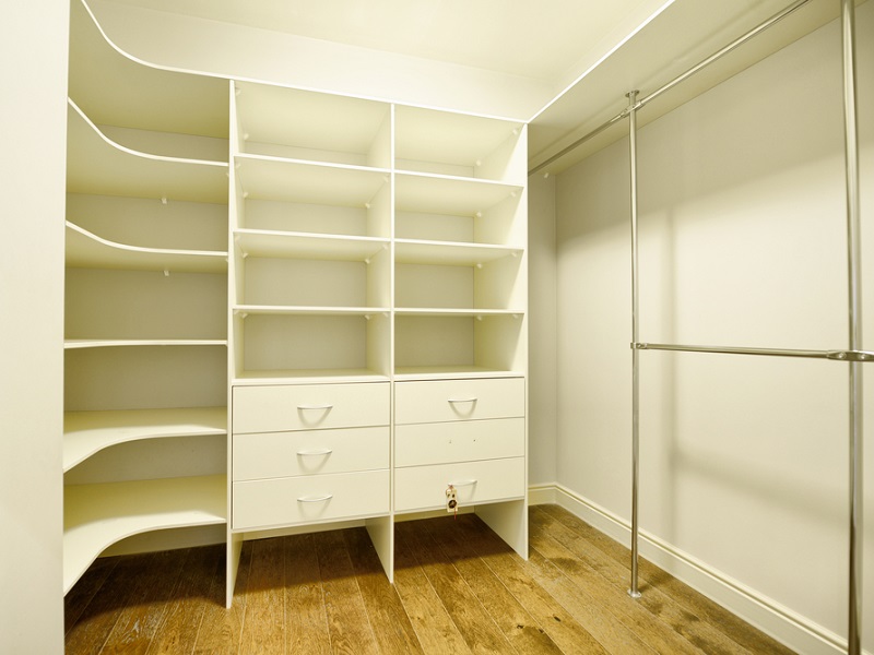 Шкаф с нишей и выдвижными ящиками в светлых тонах.