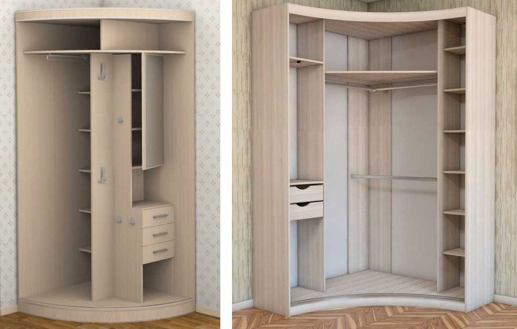 Оснащается штангами для одежды, полками и выдвижными ящиками.
