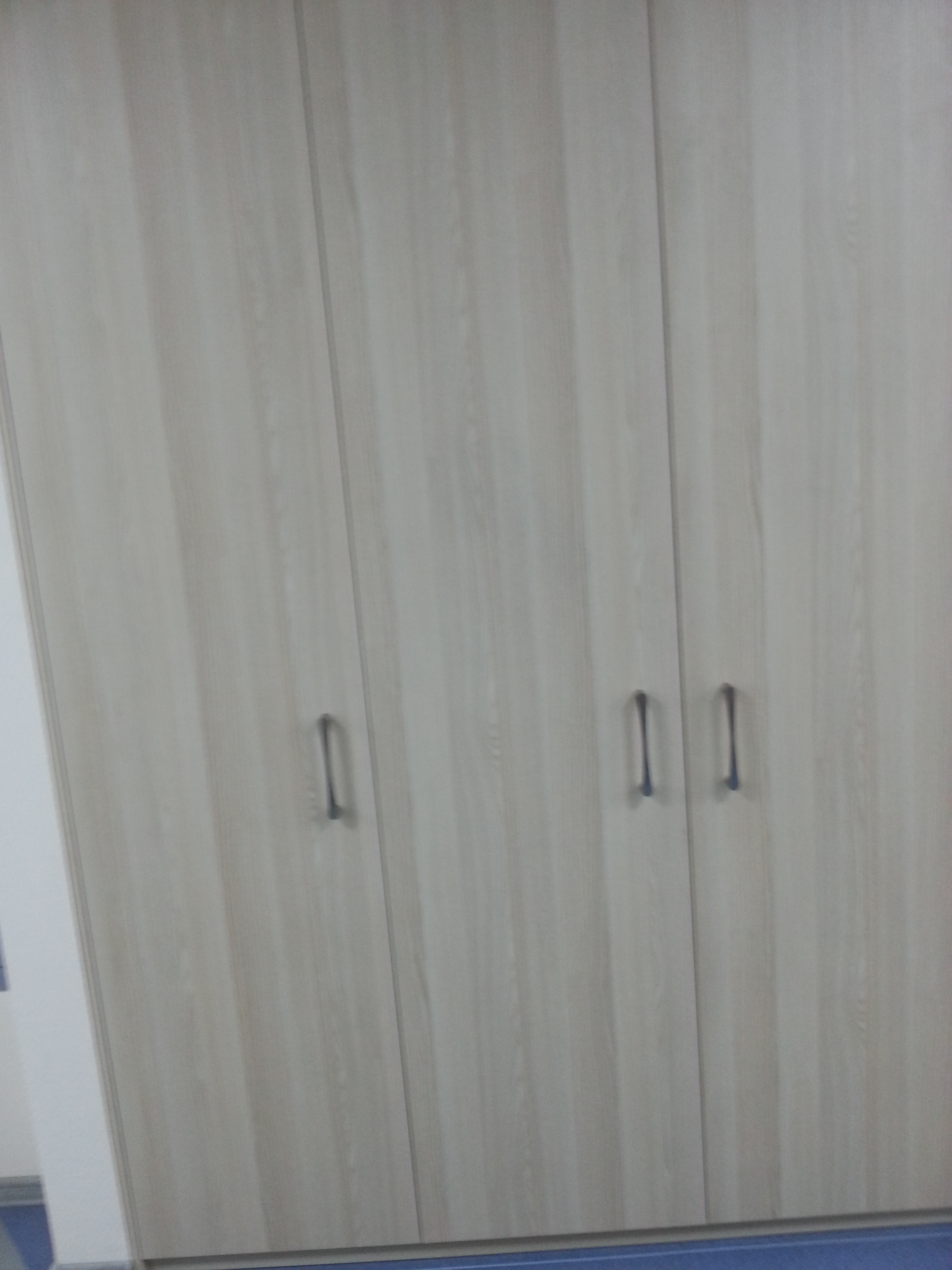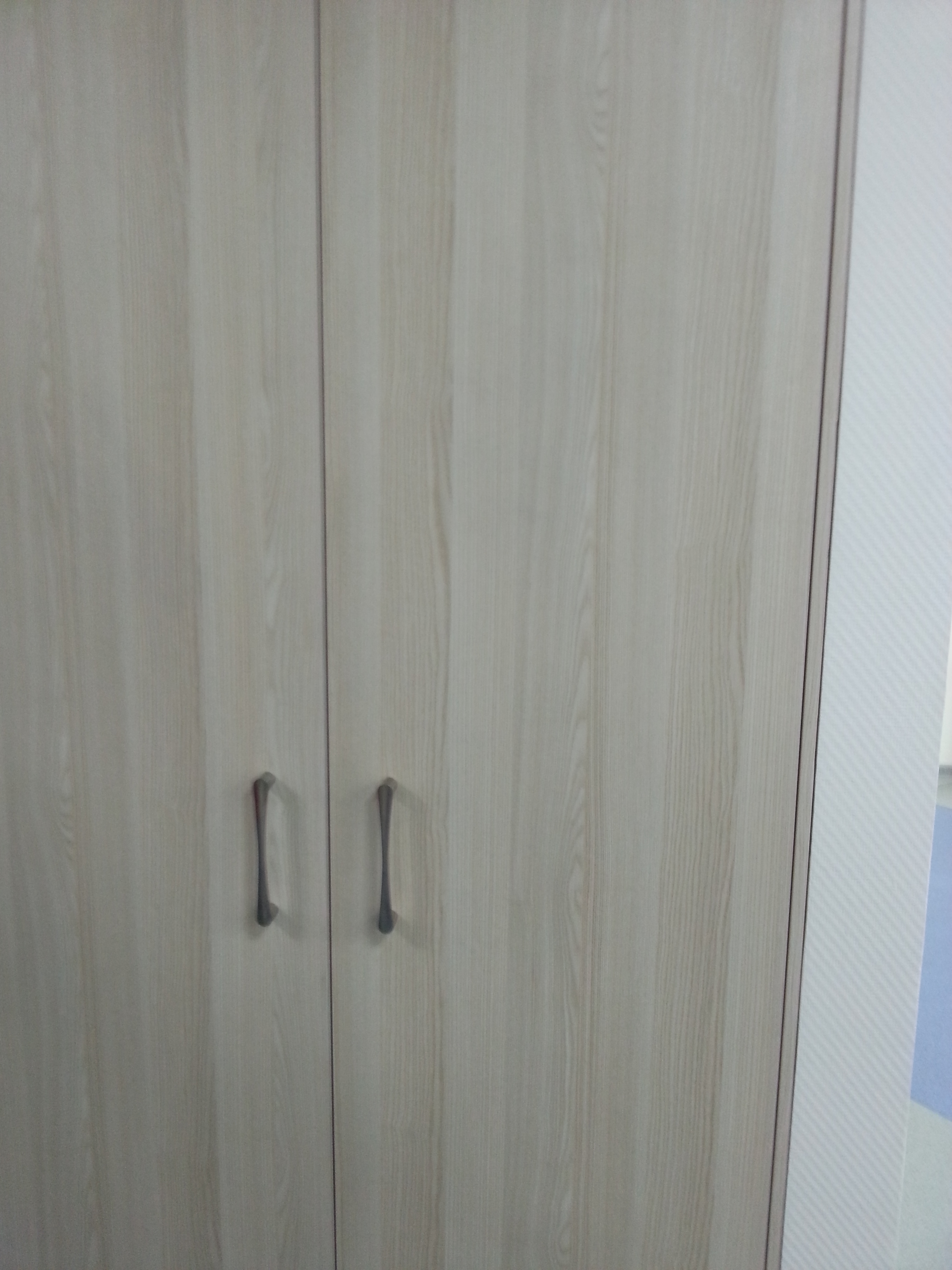Встроенный в нишу высокий распашной гардеробный шкаф на три створки. Фасад под светлое дерево с прямоугольными ручками-скобами. Удобное стандартное наполнение может быть изменено на усмотрение заказчика.