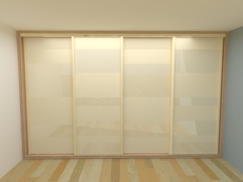 Торцы под орех, профиль окрашен в кремовый оттенок, каркас белого цвета. Фасад декорирован прямоугольным сочетанием матового песочного и глянцевого лакобеля дымчато-белого оттенка.