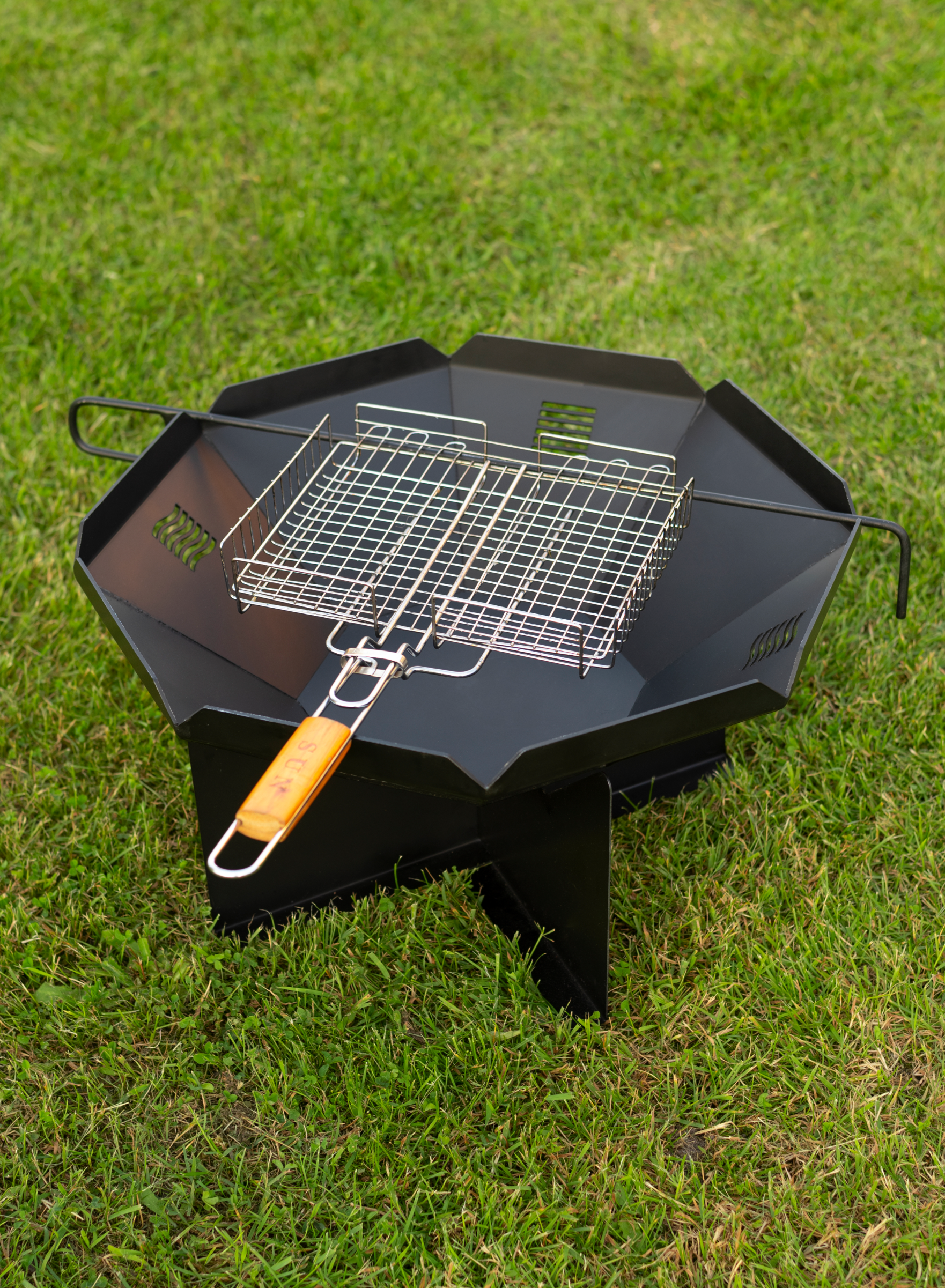 Стационарный очаг можно использовать для приготовления шашлыка на шампурах или с использованием решетки для гриля, поскольку он имеет специальные выемки и подпорку-кочергу для их установки. В центре чаши на дне находится небольшое отверстие в форме желудя для слива воды.
