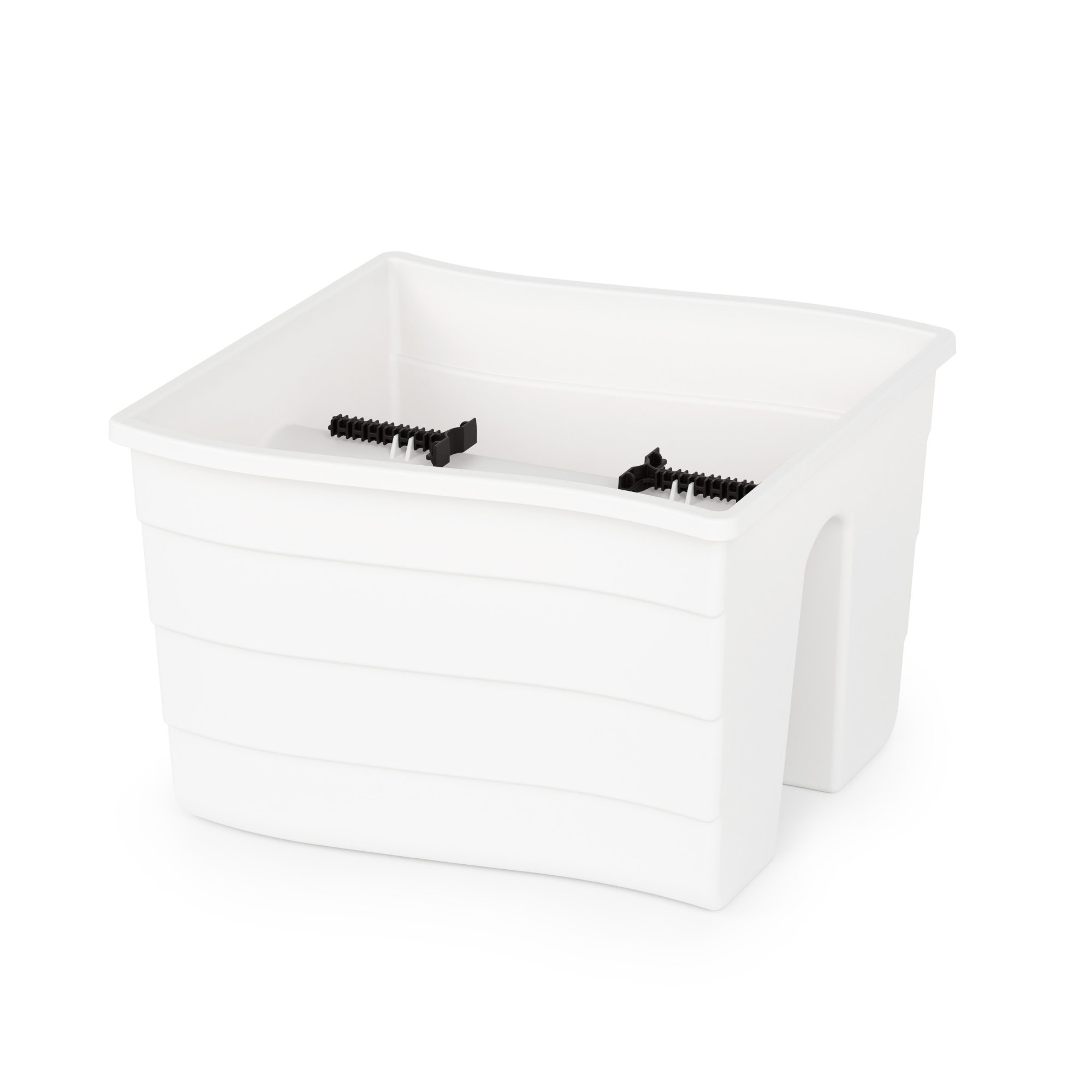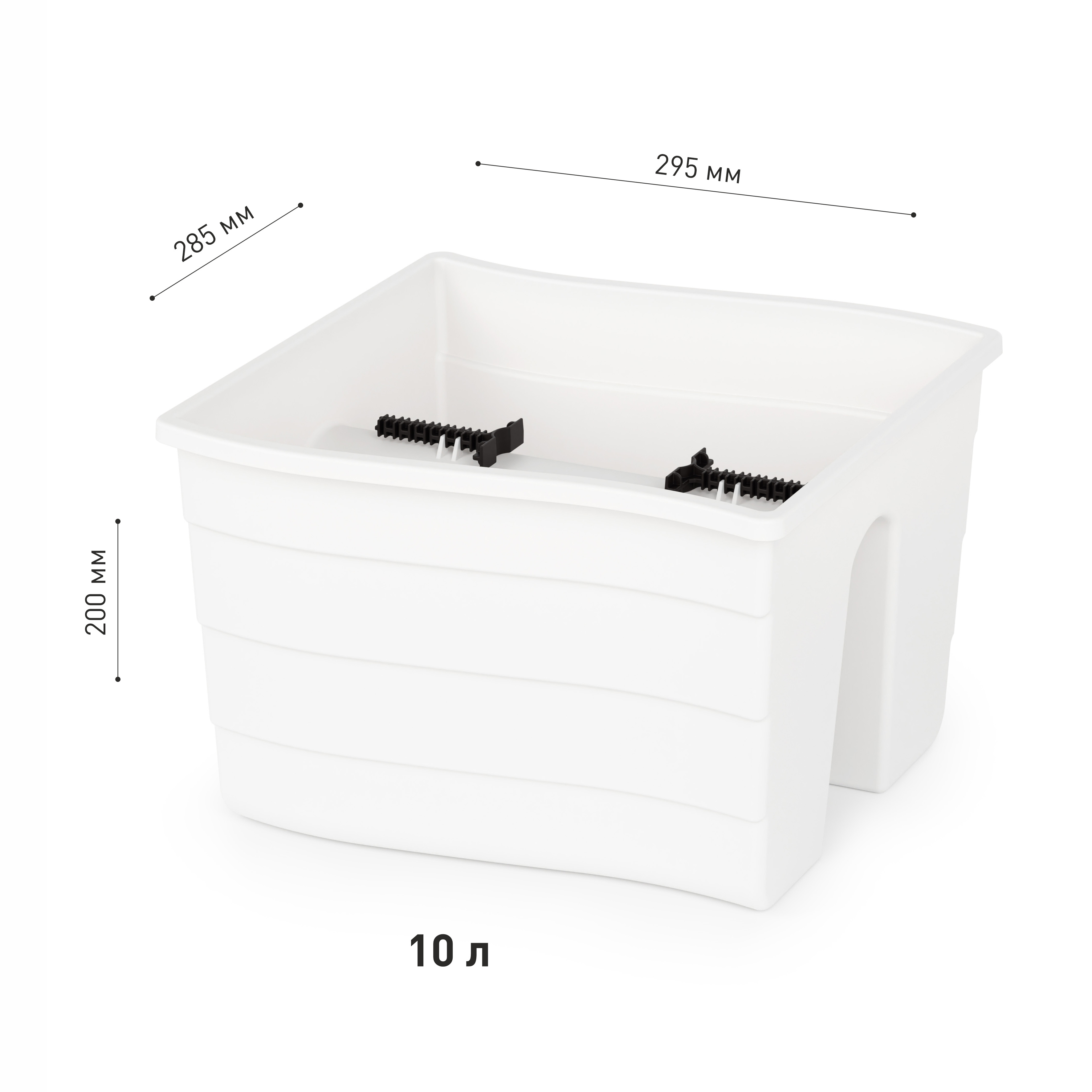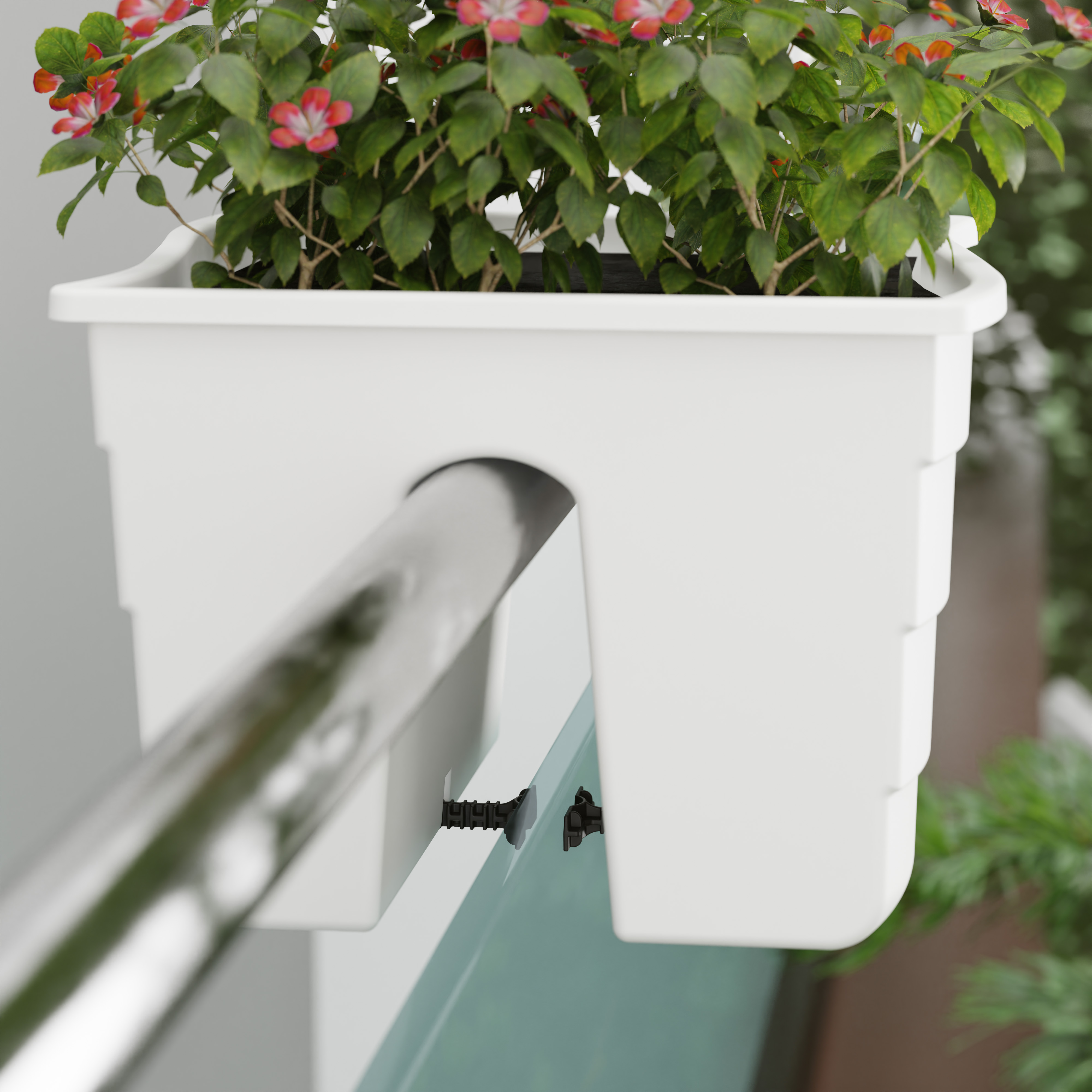 Кашпо легко установить на перила лестниц, ограждения открытых балконов, декоративные стенки. Специальные зажимы позволяют закрепить кашпо на разной ширине перила. Максимальная ширина рейлинга - до 5 см. Дно оснащено столбиками с отверстиями для отвода лишней воды во время дождя или при чрезмерном поливе.