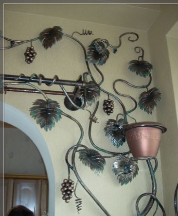 Кованый карниз стилизован под обширно-разросшуюся виноградную лозу. Кованый металл местами даже украшен гроздями винограда. Широкие листья данного предмета интерьера имеют слегка зеленоватый оттенок. Карниз оснащен кольцами для размещения в них вазонов с живыми цветами.