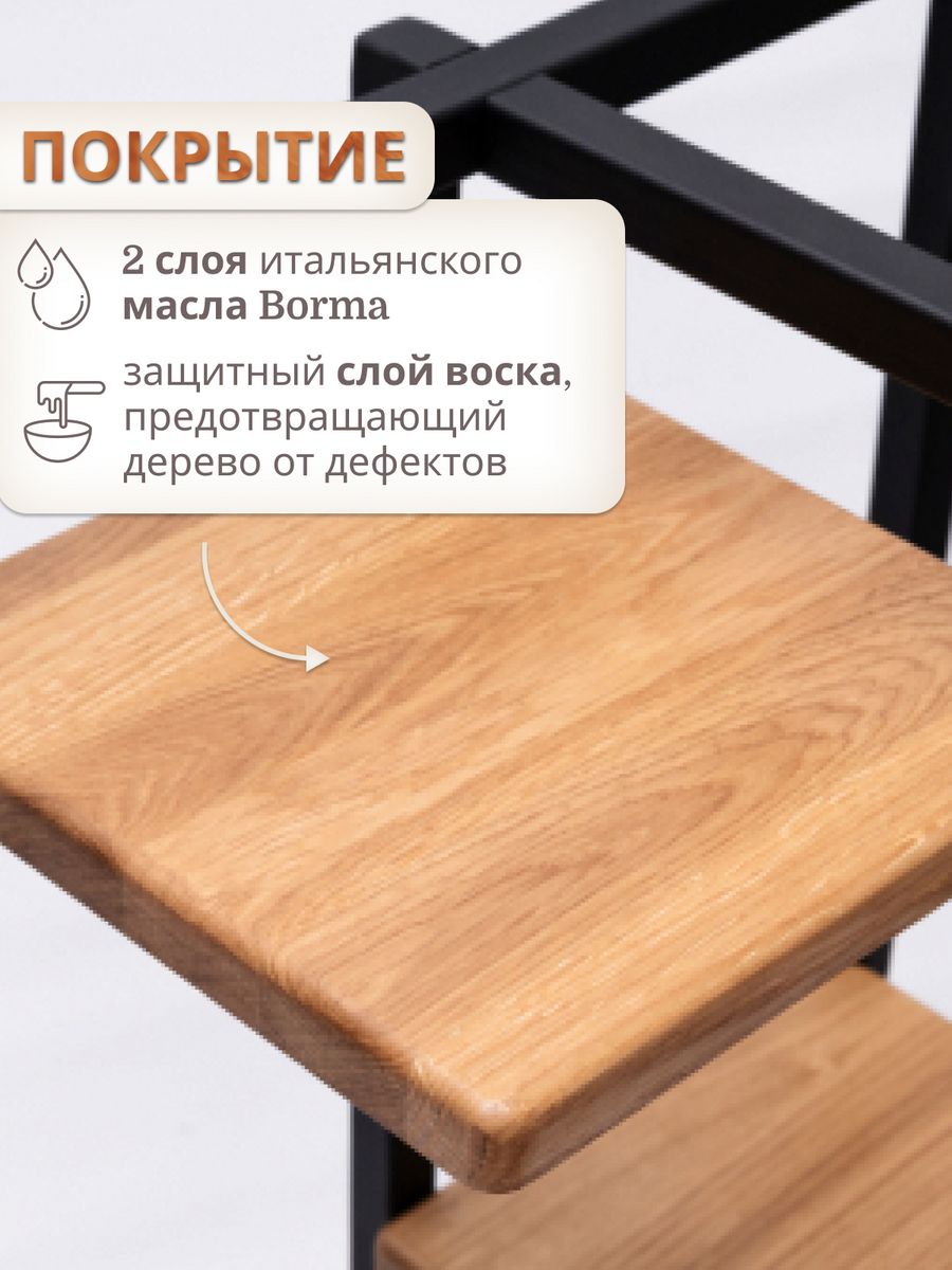 Полимерное покрытие каркаса — устойчиво к воде, царапинам и появлению ржавчины. На основании установлены пластиковые заглушки, которые защищают пол от царапин и черных следов. Массив дуба, используемый для полочки — приятный на ощупь материал, покрытый двумя слоями итальянского масла Borma и специальным воском, которые позволят сохранить свой первоначальный вид на протяжении длительного времени.