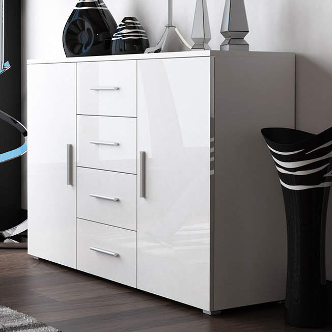 Минималистичный белый комод с четырьмя выдвижными ящиками без ручек.