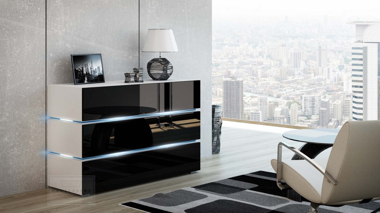 Черно-белый комод К15 в глянце является типичным представителем стиля хай-тек.
