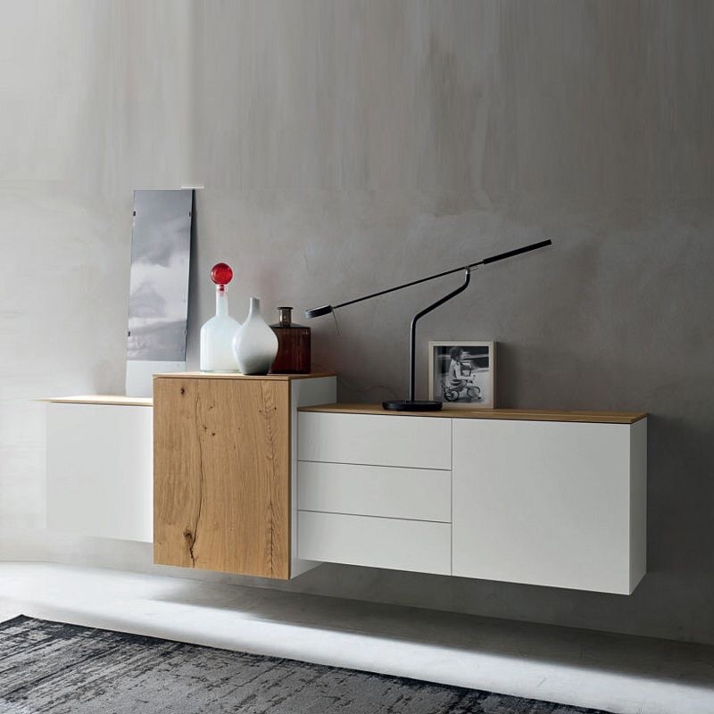Плоский подвесной комод из четырех секций, одна из которых резко выступает. Изделие отличается современным видом, и прекрасно впишется в интерьер лофт. Белые фасады оснащены системой открывания нажатием, поэтому выглядят весьма современно. Просторные прямоугольные ящики пригодны для хранения белья, хозяйственных мелочей и прочих вещей.