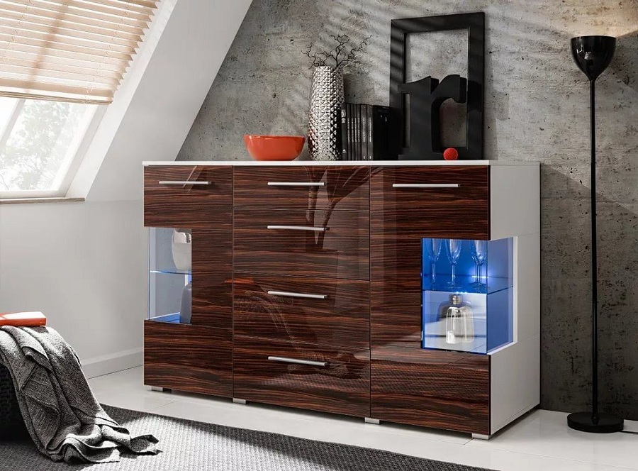 Комод выполнен из комбинации двух материалов ЛДСП и МДФ.