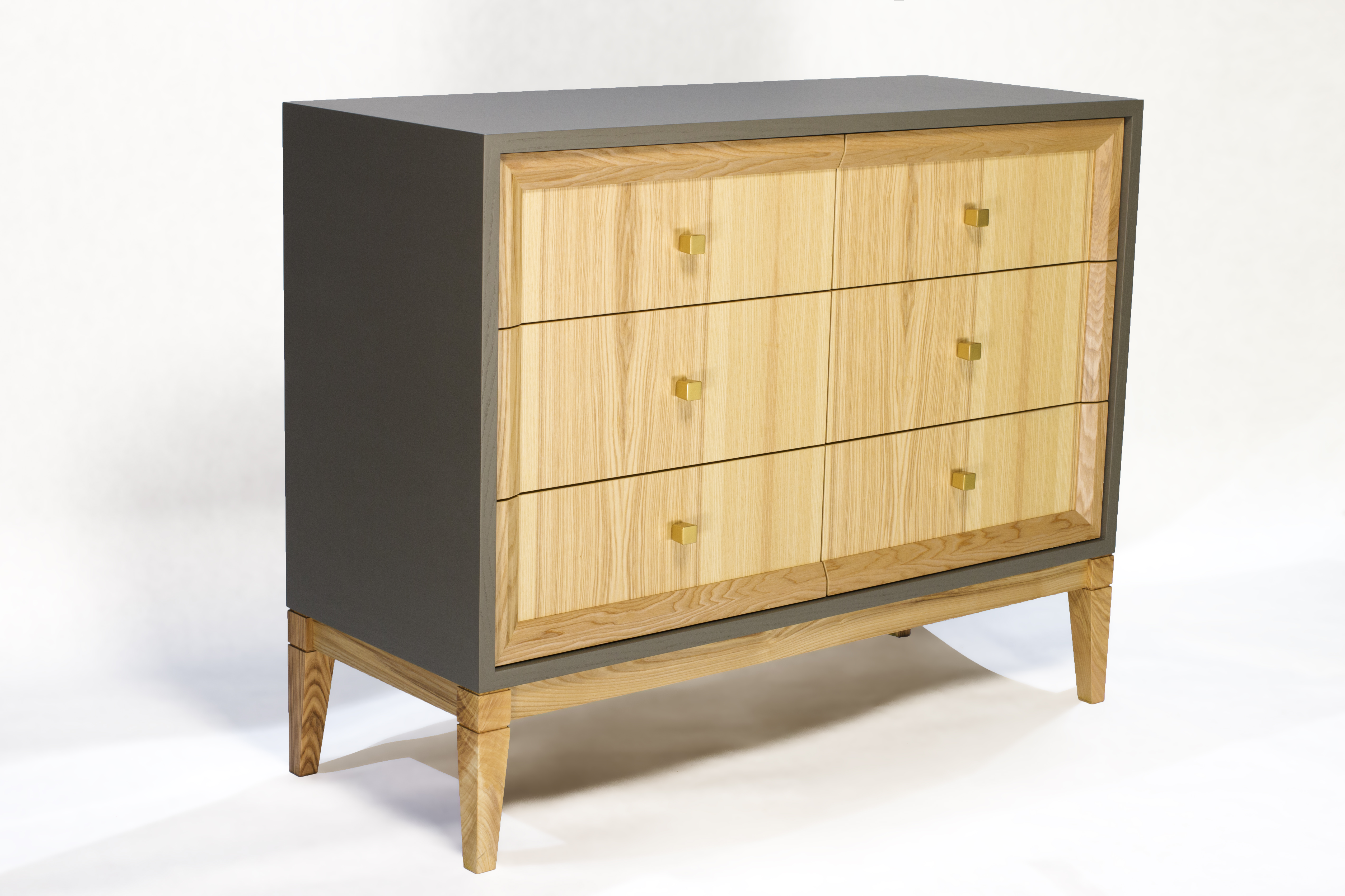 Изысканный комод из массива ясеня представлен в светлом цвете фасадов, которые были покрыты комбинацией из матовой эмали и матового лака. Изделие достаточно функциональное, с шестью выдвижными шуфлядами для разнообразных вещей. Современный направляющие Blum обеспечат бесшумное выдвижение шуфлядок.