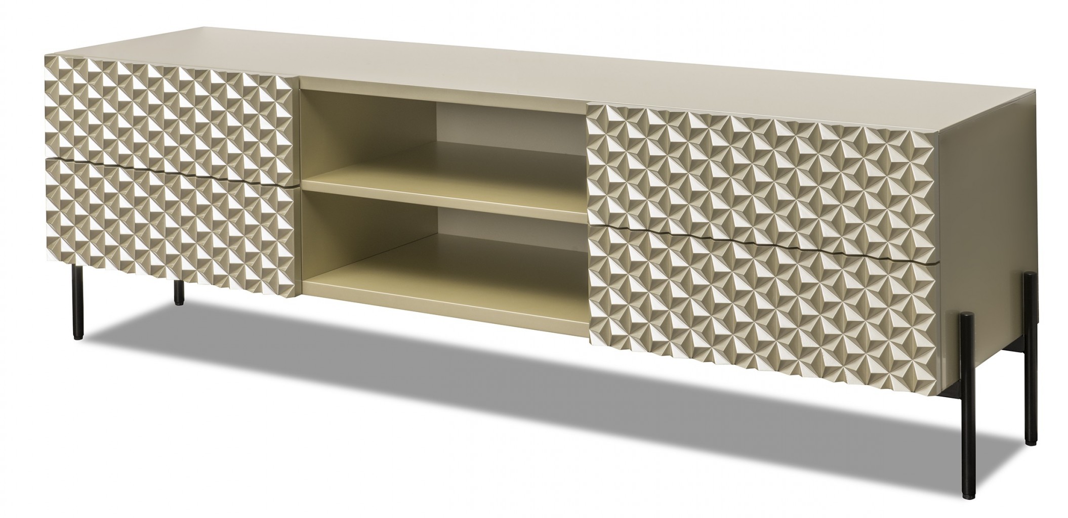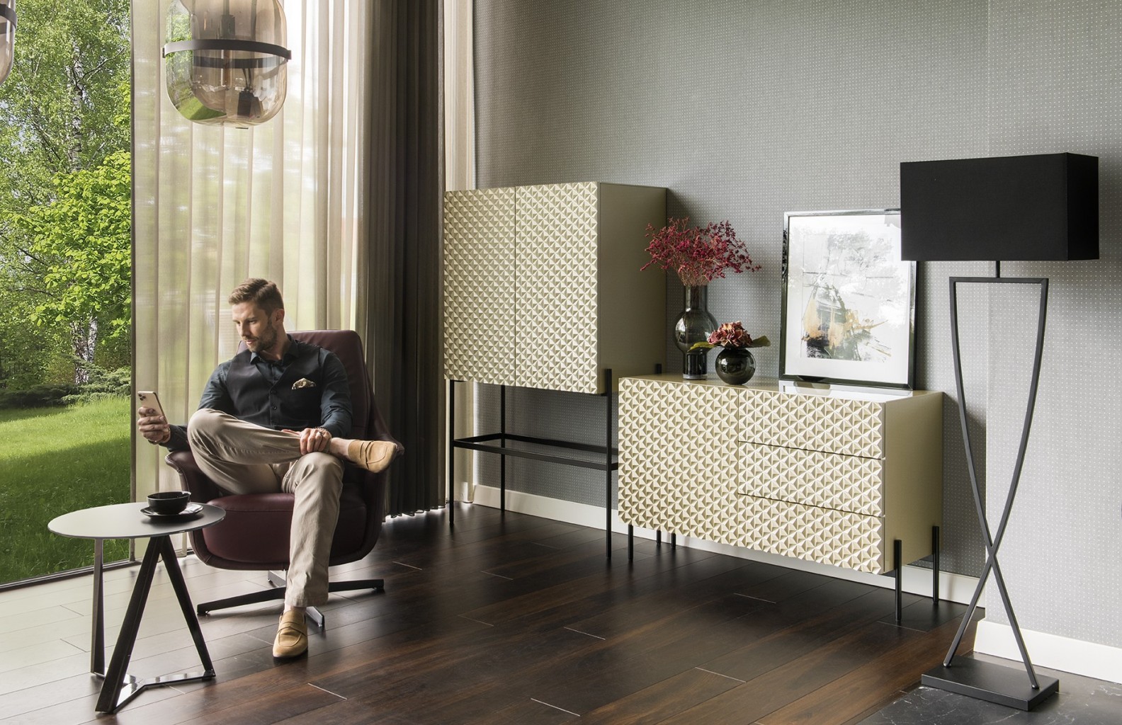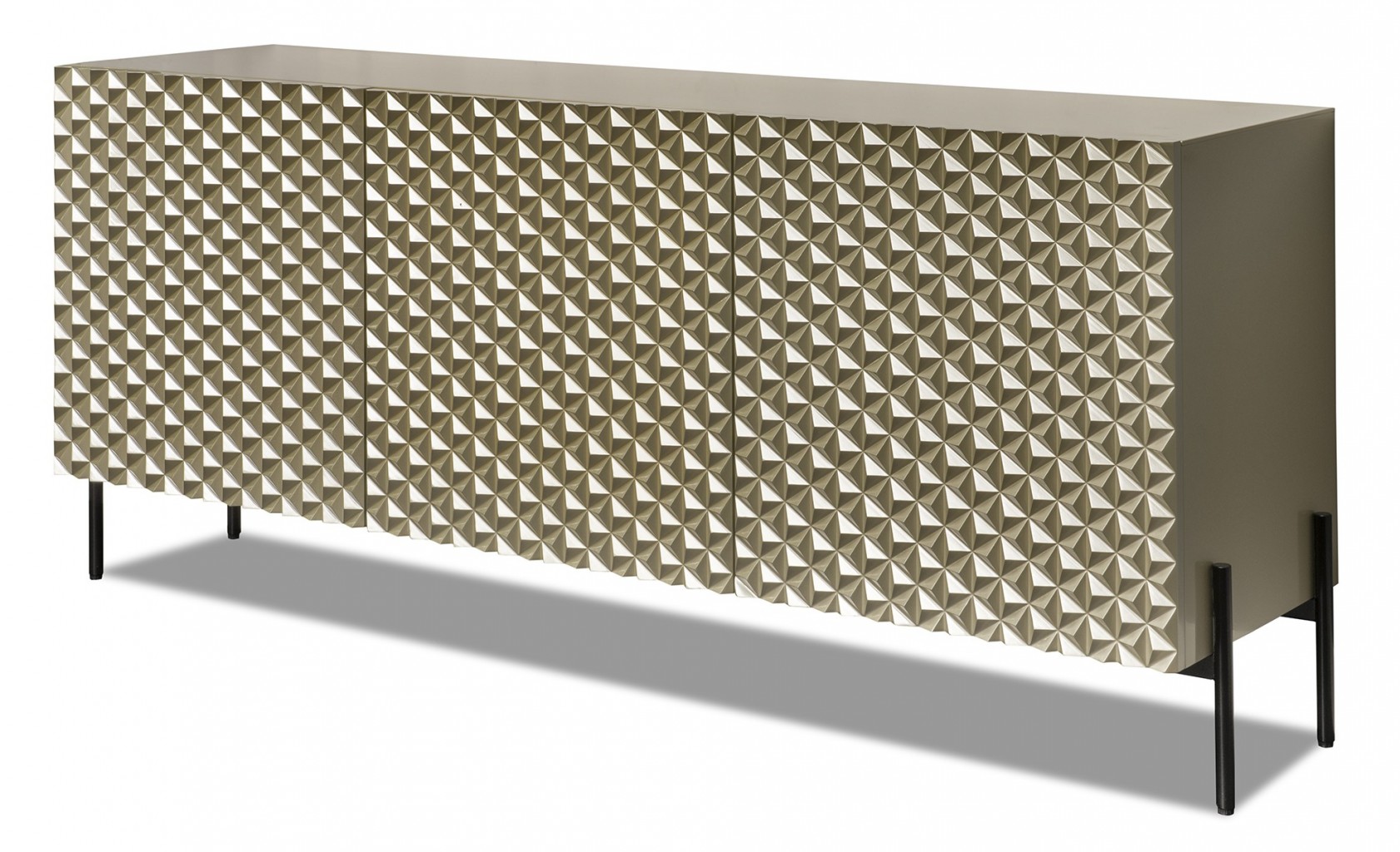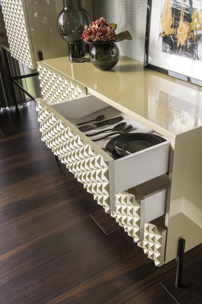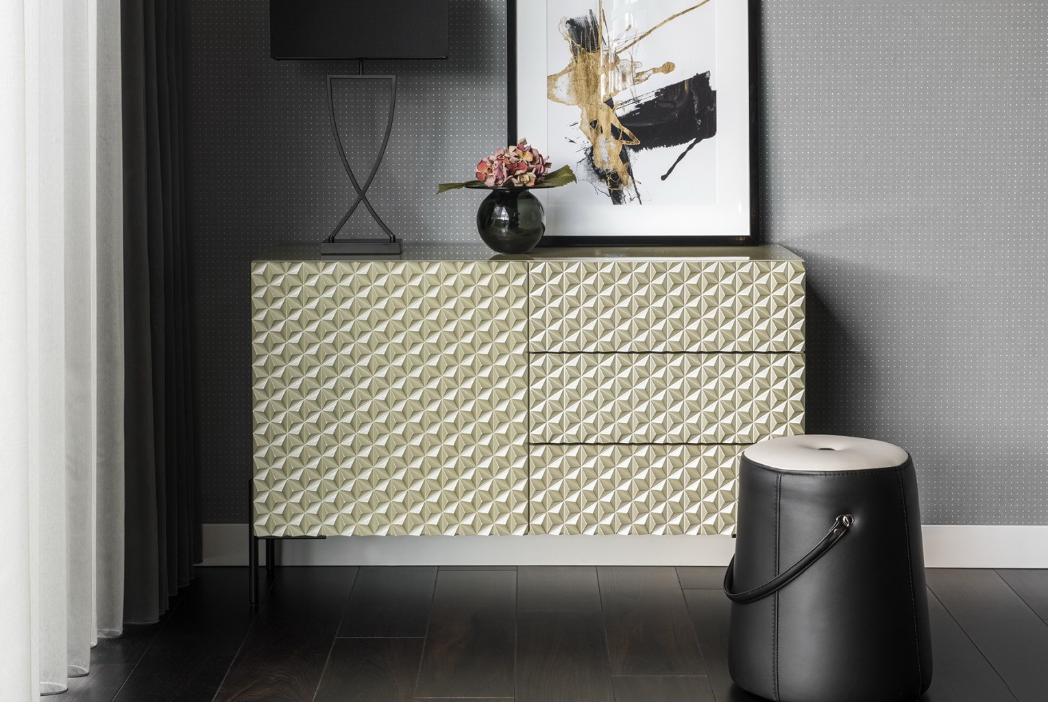 Коллекция корпусной мебели AMABILE, созданная итальянскими дизайнерами, задает тон всему окружающему пространству. Интригующая, по-настоящему современная мебель, в дизайне которой сочетаются два противоположных качества: простота и декоративность. Фрезерованный однородный рисунок фасадов – это очень ритмичный, будто хрустальный шлиф, пробуждающий живую игру света и тени на поверхности. Коллекция включает в себя закрытые комоды (с дверцами или ящиками), тумбу под телевизор (открытая полка в центре и ящики по бокам), а также мини-бар (внутри держатель для бокалов, полки для бутылок, на задней стенке зеркало). За исключением мини-бара, металлические ножки на внешней стороне корпуса (черные или золотые) могут быть заменены подставками типа slim edge или изготовленными из поликарбоната. Фасад и корпус мебели покрыты матовым или глянцевым лаком; в комплекте также можно приобрести прикроватную тумбочку.