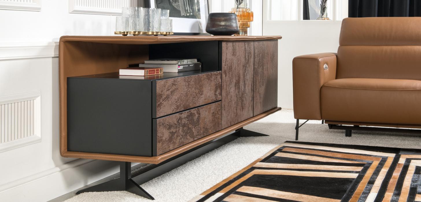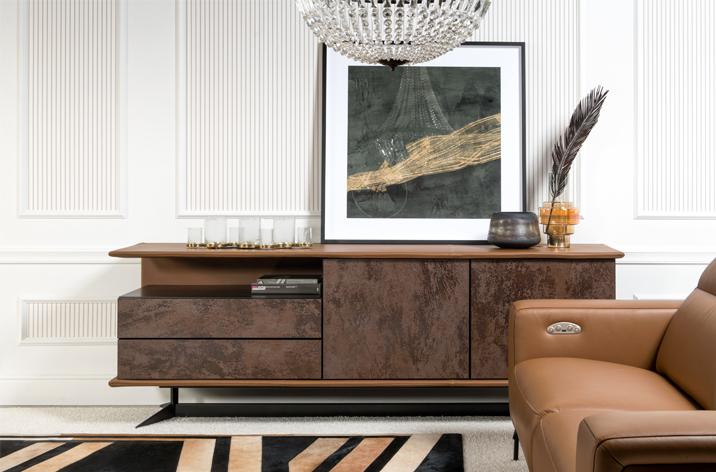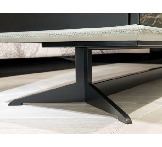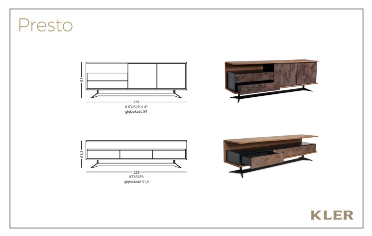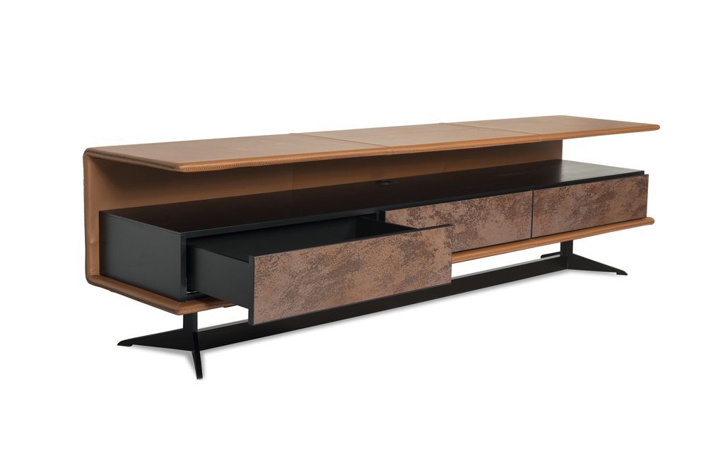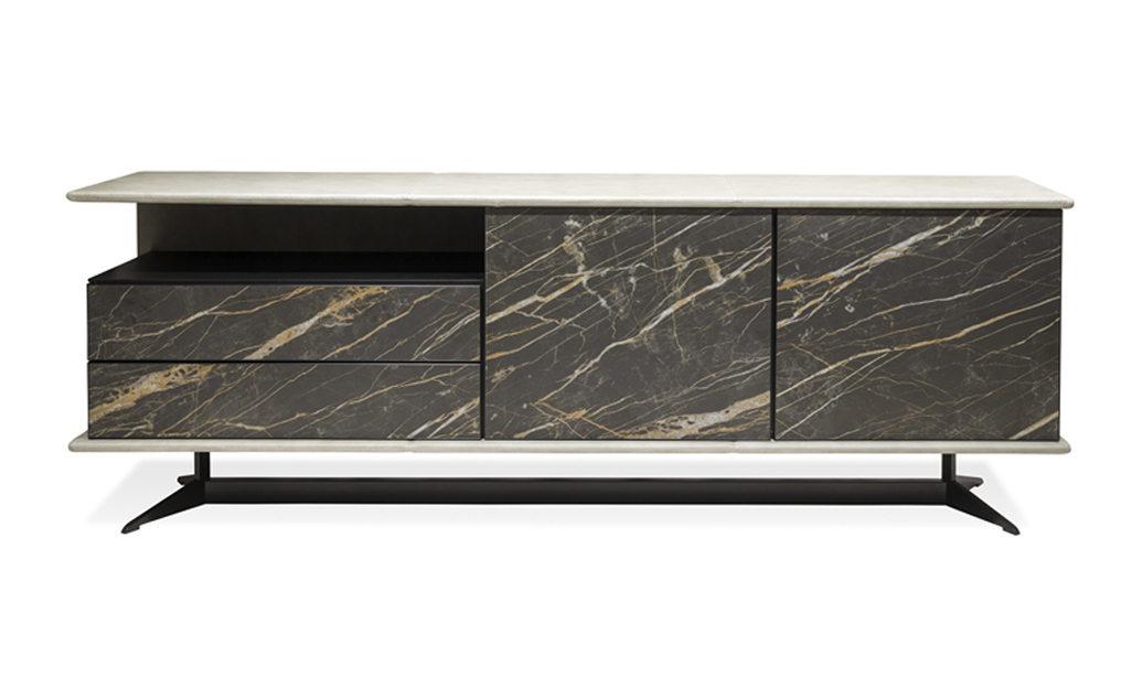 Комод Presto – это необычный, по-настоящему современный комод с двумя дверцами, двумя ящиками и одной открытой полкой. Presto представляет собой комбинацию наружного корпуса, открытого спереди и по бокам, и установленных в нем как контейнеры, соответствующих шкафчиков, закрытых ящиками и дверцами. Качество изготовления восхищает: края столешницы подчеркнуты искусным крестообразным швом, а дверца изнутри и дно ящиков обиты мягкой искусственной кожей. Основа и металлические ножки окрашены.