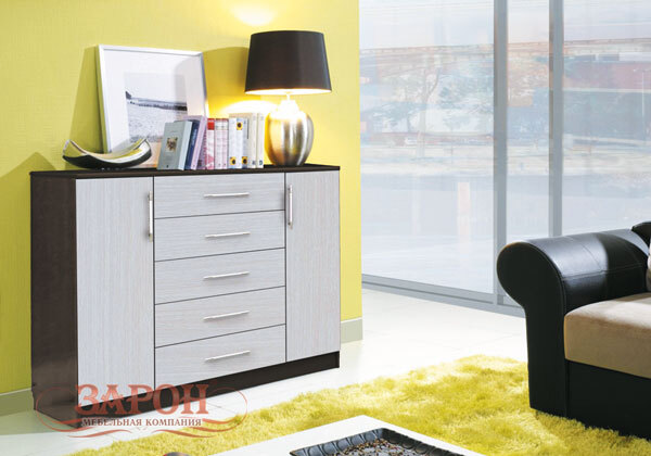 Комод с открытой секцией для журналов, выдвижными ящиками и 2-мя закрытыми отделениями.