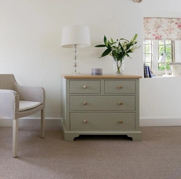 Минималистичный белый комод с четырьмя выдвижными ящиками без ручек.