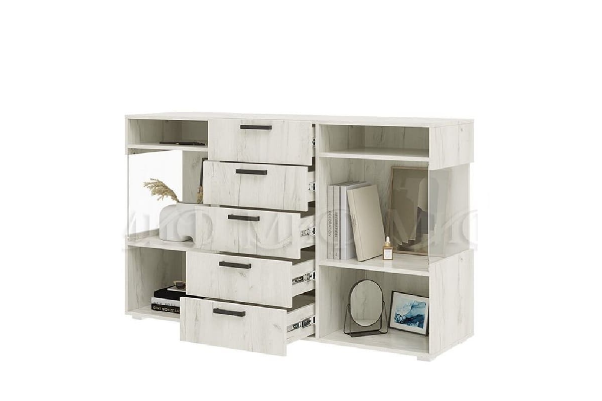Белый матовый комод декорирован вставками в цвете светлого дуба.