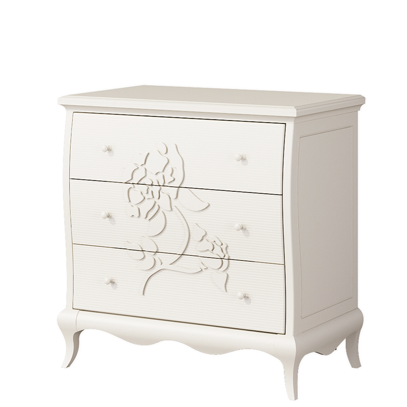 Белый комод с матовыми фасадами. Наполнение: три ящика, полка.